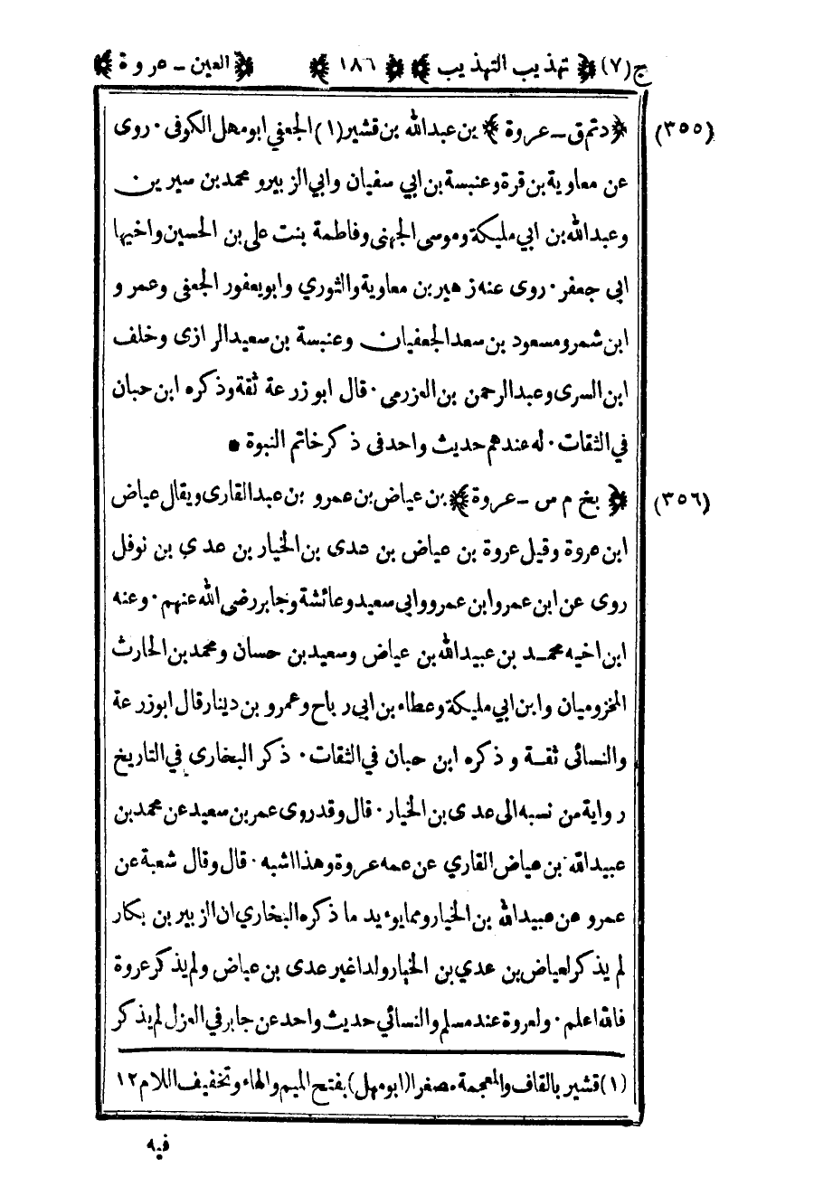 381 - - "د تم ق – عروة" بن عبد الله بن قشير الجعفي أبو مهل الكوفي روى عن معاوية بن قرة وعنبسة بن أبي سفيان وأبي الزبير ومحمد بن سيرين وعبد الله بن أبي مليكة وموسى الجهني وفاطمة بنت علي بن الحسين وأخيها أبي جعفر روى عنه زهير بن معاوية والثوري وأبو يعفور الجعفي وعمرو بن شمر ومسعود بن سعد الجعفيان وعنبسة بن سعيد الرازي وخلف بن السري وعبد الرحمن بن العزرمي قال أبو زرعة ثقة وذكره بن حبان في الثقات له عندهم حديث واحد في ذكر خاتم النبوة