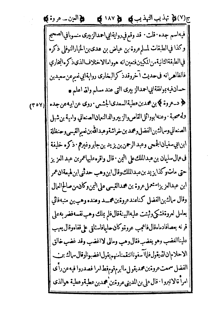 فيه اسم جده قلت قد وقع في رواية أبي أحمد الزبيري منسوبا في الصحيح وكذا في الطبقات لمسلم عروة بن عياض بن عدي بن الخيار النوفلي ذكره في الطبقة الثانية من المكيين فتعين أنه هو وأما الاختلاف الذي ذكره البخاري فالظاهر أنه في حديث آخر وقد ذكر البخاري رواية أبي نعيم عن سعيد بن حسان فيه بموافقة أبي أحمد الزبيري التي عند مسلم والله أعلم381 - - "د – عروة" بن محمد بن عطية السعدي الجشمي روى عن أبيه عن جده وله صحبة وعنه أبو وائل القاص والزبير والد النعمان الصنعاني وأمية بن شبل الصنعاني وسماك بن الفضل ومحمد بن خراشة وعبد الله بن نعيم القيسي وحنظلة بن أبي سفيان الجمحي وعبد الرحمن بن يزيد بن جابر وغيرهم ذكره خليفة في عمال سليمان بن عبد الملك على اليمن قال وأقره عليها عمر بن عبد العزيز حتى مات وكذا يزيد بن عبد الملك وقال بن وهب حدثني بن لهيعة أن عمر بن عبد العزيز استعمل عروة بن محمد القيسي على اليمن وكان من صالح العمال وقال سماك بن الفضل كنا عند عروة بن محمد وعنده وهب بن منبه فأتي بعامل لعروة فشكى وثبتت عليه البينة قال فلم يملك وهب نفسه فضربه على قرنه بعصا فأدماه قال فأعجب عروة وكان حليما فاستلقى على قفاه وقال يعيب علينا الغضب وهو يغضب فقال وهب ومالي لا أغضب وقد غضب خالق الأحلام أن الله يقول فلما آسفونا انتقمنا منهم يقول أغضبونا وقال سماك بن الفضل سمعت عروة بن محمد يقول ما أبرم قوم قط أمرا فصدروا فيه عن رأي امرأة الا تبروا قال علي بن المديني عروة بن محمد بن عطية وعطية هو الذي