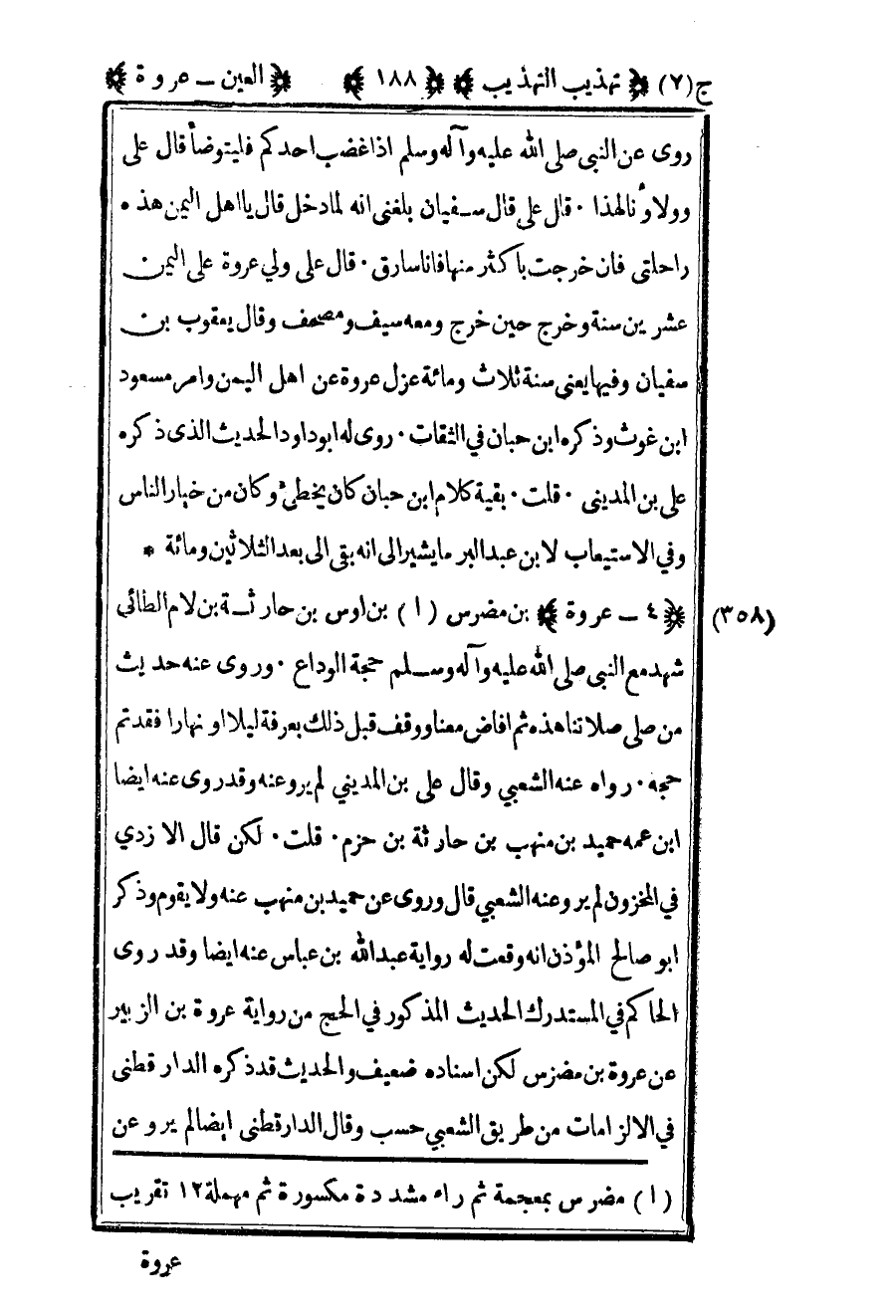 381 - - "4 – عروة" بن مضرس1 بن أوس بن حارثة بن لام الطائي شهد مع النبي صلى الله عليه وسلم حجة الوداع وروى عنه حديث "من صلى صلاتنا هذه ثم أفاض معنا ووقف قبل ذلك بعرفة ليلا أو نهارا فقد تم حجة" رواه عنه الشعبي وقال علي بن المديني لم يرو عنه وقد روى عنه أيضا بن عمه حميد بن منهب بن حارثة بن حزم قلت لكن قال الأزدي في المخزون لم يرو عنه الشعبي قال وروى عن حميد بن منهب عنه ولا يقوم وذكر أبو صالح المؤذن أنه وقعت له رواية عبد الله بن عباس عنه أيضا وقد روى الحاكم في المستدرك الحديث المذكور في الحج من رواية عروة بن الزبير عن عروة بن مضرس لكن إسناده ضعيف والحديث قد ذكره الدارقطني في الالزامات من طريق الشعبي حسب وقال الدارقطني أيضا لم يرو عن