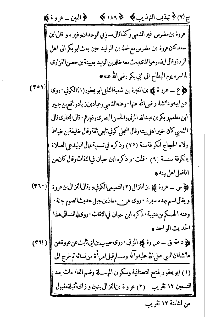 381 - - "ع – عروة" بن المغيرة بن شعبة الثقفي أبو يعفور1 الكوفي روى عن أبيه وعائشة رضي الله عنها وعنه الشعبي وعباد بن زياد ونافع بن جبير بن مطعم وبكر بن عبد الله المزني والحسن البصري وغيرهم قال البخاري قال الشعبي كان خير أهل بيته وقال العجلي كوفي تابعي ثقة وقال خليفة بن خياط ولاه الحجاج الكوفة سنة 75 وذكره في تسمية عمال الوليد على الصلاة بالكوفة سنة 9 قلت وذكره بن حبان في الثقات وقال كان من أفاضل أهل بيته381 - - "س – عروة" بن النزال2 التميمي الكوفي ويقال النزال بن عروة ويقال اسم جده سبرة روى عن معاذ بن جبل حديث الصوم جنة وعنه الحكم بن عتيبة ذكره بن حبان في الثقات روى له النسائي هذا الحديث الواحد381 - - "د ت ق – عروة" المزني روى حبيب بن أبي ثابت عن عروة عن عائشة أن النبي صلى الله عليه وسلم قبل امرأة من نسائه ثم خرج إلى
