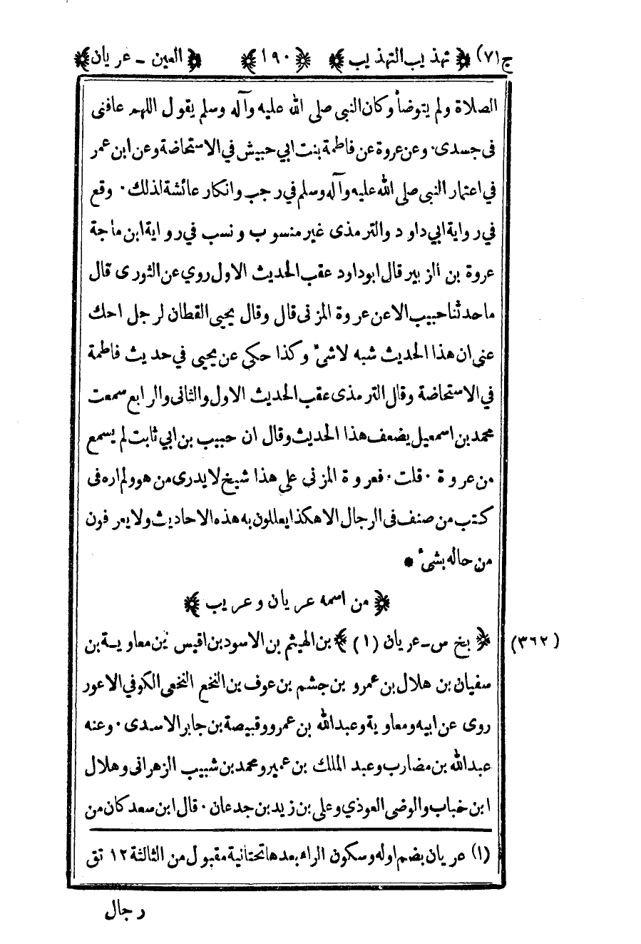 الصلاة ولم يتوضأ وكان النبي صلى الله عليه وسلم يقول "اللهم عافني في جسدي" وعن عروة عن فاطمة بنت أبي حبيش في الاستحاضة وعن بن عمر في اعتمار النبي صلى الله عليه وسلم في رجب وانكار عائشة لذلك وقع في رواية أبي داود والترمذي غير منسوب ونسب في رواية بن ماجة عروة بن الزبير قال أبو داود عقب الحديث الأول روى عن الثوري قال ما حدثنا حبيب الا عن عروة المزني قال وقال يحيى القطان لرجل احك عني أن هذا الحديث شبه لا شيء وكذا حكى عن يحيى في حديث فاطمة في الاستحاضة وقال الترمذي عقب الحديث الأول والثاني والرابع سمعت محمد بن إسماعيل يضعف هذا الحديث وقال إن حبيب بن أبي ثابت لم يسمع من عروة قلت فعروة المزني على هذا شيخ لا يدري من هو ولم أره في كتب من صنف في الرجال الا هكذا يعللون به هذه الأحاديث ولا يعرفون من حاله بشيء