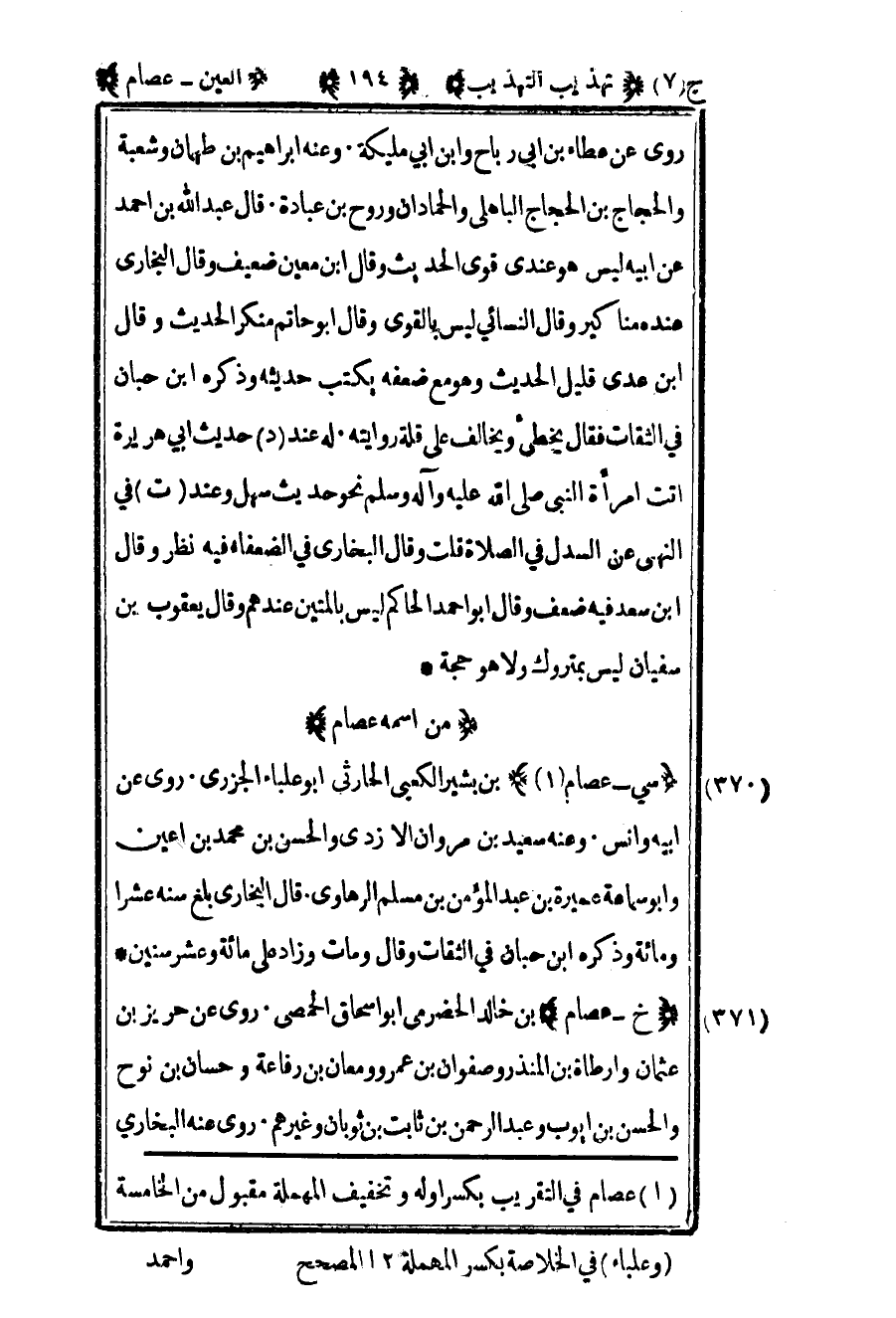 1 عصام في التقريب بكسرأوله وتخفيف المهملة مقبول من الخامسة "وعلياء"في الخلاصة المهملة 12 المصحح