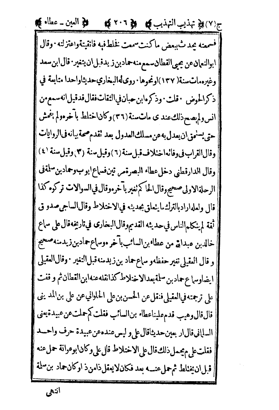 مات سنة 36 وكان اختلط بآخره ولم يفحش حتى يستحق أن يعدل به عن مسلك العدول بعد تقدم صحة بيانه في الروايات وقال القراب في وفاته اختلاف قبل سنة 6 وقيل سنة 3 وقيل سنة 4 وقال الدارقطني دخل عطاء البصرة مرتين فسماع أيوب وحماد بن سلمة في الرحلة الأولى صحيح وقال الحاكم تغير بآخره وقال في السؤالات تركوه كذا قال ولعله أراد بالترك ما يتعلق بحديثه في الاختلاط وقال الساجي صدوق ثقة لم يتكلم الناس في حديثه القديم وقال البخاري في تاريخه قال على سماع خالد بن عبد الله من عطاء بن السائب بآخره وسماع حماد بن زيد منه صحيح وقال العقيلي تغير حفظه وسماع حماد بن زيد منه قبل التغير وقال العقيلي أيضا وسماع حماد بن سلمة بعد الاختلاط كذا نقله عنه بن القطان ثم وقفت على ترجمته في العقيلي فنقل عن الحسن بن علي الحلواني عن علي بن المديني قال قال وهيب قدم علينا عطاء بن السائب فقلت كم حملت عن عبيدة يعني السلماني قال أربعين حديثا قال علي وليس عنده عن عبيدة حرف واحد فقلت علام يحمل ذلك قال على الاختلاط قال علي وكان أبو عوانة حمل عنه قبل أن يختلط ثم حمل عنه بعد فكان لا يعقل ذا من ذا وكان حماد بن سلمة