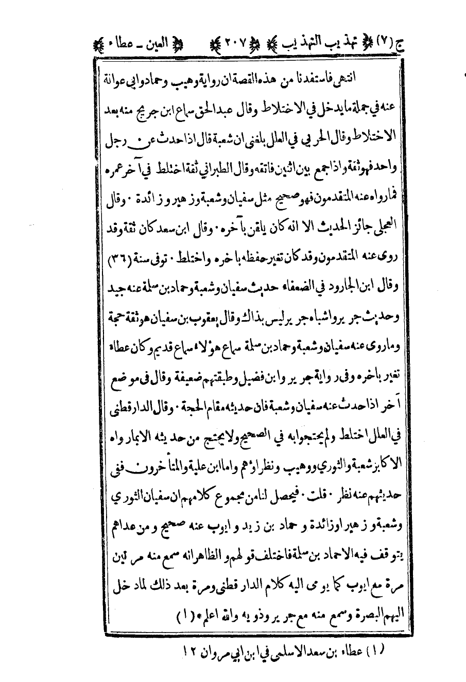 انتهى فاستفدنا من هذه القصة أن رواية وهيب وحماد وأبي عوانة عنه في جملة ما يدخل في الاختلاط وقال عبد الحق سماع بن جريج منه بعد الاختلاط وقال الحربي في العلل بلغني أن شعبة قال إذا حدث عن رجل واحد فهو ثقة وإذا جمع بين اثنين فاتقه وقال الطبراني ثقة اختلط في آخر عمره فما رواه عنه المتقدمون فهو صحيح مثل سفيان وشعبة وزهير وزائدة وقال العجلي جائز الحديث الا أنه كان يلقن بآخره وقال بن سعد كان ثقة وقد روى عنه المتقدمون وقد كان تغير حفظه بآخره واختلط توفي سنة 36 وقال بن الجارود في الضعفاء حديث سفيان وشعبة وحماد بن سلمة عنه جيد وحديث جرير وأشباه جرير ليس بذاك وقال يعقوب بن سفيان هو ثقة حجة وما روى عنه سفيان وشعبة وحماد بن سلمة سماع هؤلاء سماع قديم وكان عطاء تغير بآخره وفي رواية جرير وابن فضيل وطبقتهم ضعيفة وقال في موضع آخر إذا حدث عنه سفيان وشعبة فإن حديثه مقام الحجة وقال الدارقطني في العلل اختلط ولم يحتجوا به في الصحيح ولا يحتج من حديثه الا بما رواه الأكابر شعبة والثوري ووهيب ونظراؤهم وأما بن علية والمتأخرون ففي حديثهم عنه نظر قلت فيحصل لنا من مجموع كلامهم أن سفيان الثوري وشعبة وزهيرا وزائدة وحماد بن زيد وأيوب عنه صحيح ومن عداهم يتوقف فيه الا حماد بن سلمة فاختلف قولهم والظاهر أنه سمع منه مرتين مرة مع أيوب كما يومي إليه كلام الدارقطني ومرة بعد ذلك لما دخل إليهم البصرة وسمع منه مع جرير وذويه والله أعلم1