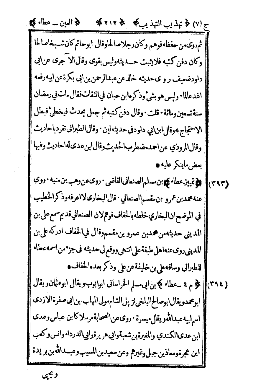 -394 "تمييز عطاء" بن مسلم الصنعاني القاضي روى عن وهب بن منبه روى عنه محمد بن عمرو بن مقسم الصنعاني قال البخاري لا أعرفه وذكر الخطيب في الموضح أن البخاري خلطه بالخفاء فوهم لأن الصنعاني قديم سمع علي بن المديني حديثه من محمد بن عمرو بن مقسم وقال في الخفاف أدركه علي بن المديني روى عنه أهل طبقة علي انتهى ووقع لي حديثه في جزء من اسمه عطاء للطبراني وساقه علي بن خليفة عن علي وذكر بعده الحفاف