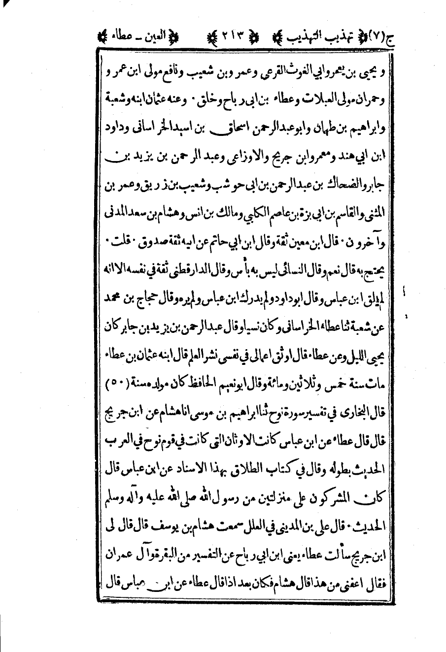 ويحيى بن يعمر وأبي الغوث القرعي وعمرو بن شعيب ونافع مولى بن عمر وحمران مولى العبلات وعطاء بن أبي رباح وخلق وعنه عثمان ابنه وشعبة وإبراهيم بن طهمان وأبو عبد الرحمن إسحاق بن أسيد الخراساني وداود بن أبي هند ومعمر وابن جريج والأوزاعي وعبد الرحمن بن يزيد بن جابر والضحاك بن عبد الرحمن بن أبي حوشب وشعيب بن زريق وعمر بن المثنى والقاسم بن أبي بزة بن عاصم الكلبي ومالك بن أنس وهشام بن سعد المدني وآخرون قال بن معين ثقة وقال بن أبي حاتم عن أبيه ثقة صدوق قلت يحتج به قال نعم وقال النسائي ليس به بأس وقال الدارقطني ثقة في نفسه الا أنه لم يلق بن عباس وقال أبو داود ولم يدرك بن عباس ولم يره وقال حجاج بن محمد عن شعبة ثنا عطاء الخراساني وكان نسيا وقال عبد الرحمن بن يزيد بن جابر كان يحيى الليل وعن عطاء قال أوثق أعمالي في نفسي نشر العلم قال ابنه عثمان بن عطاء مات سنة خمس وثلاثين ومائة وقال أبو نعيم الحافظ كان مولده سنة 5 قال البخاري في تفسير سورة نوح ثنا إبراهيم بن موسى أنا هشام عن بن جريج قال