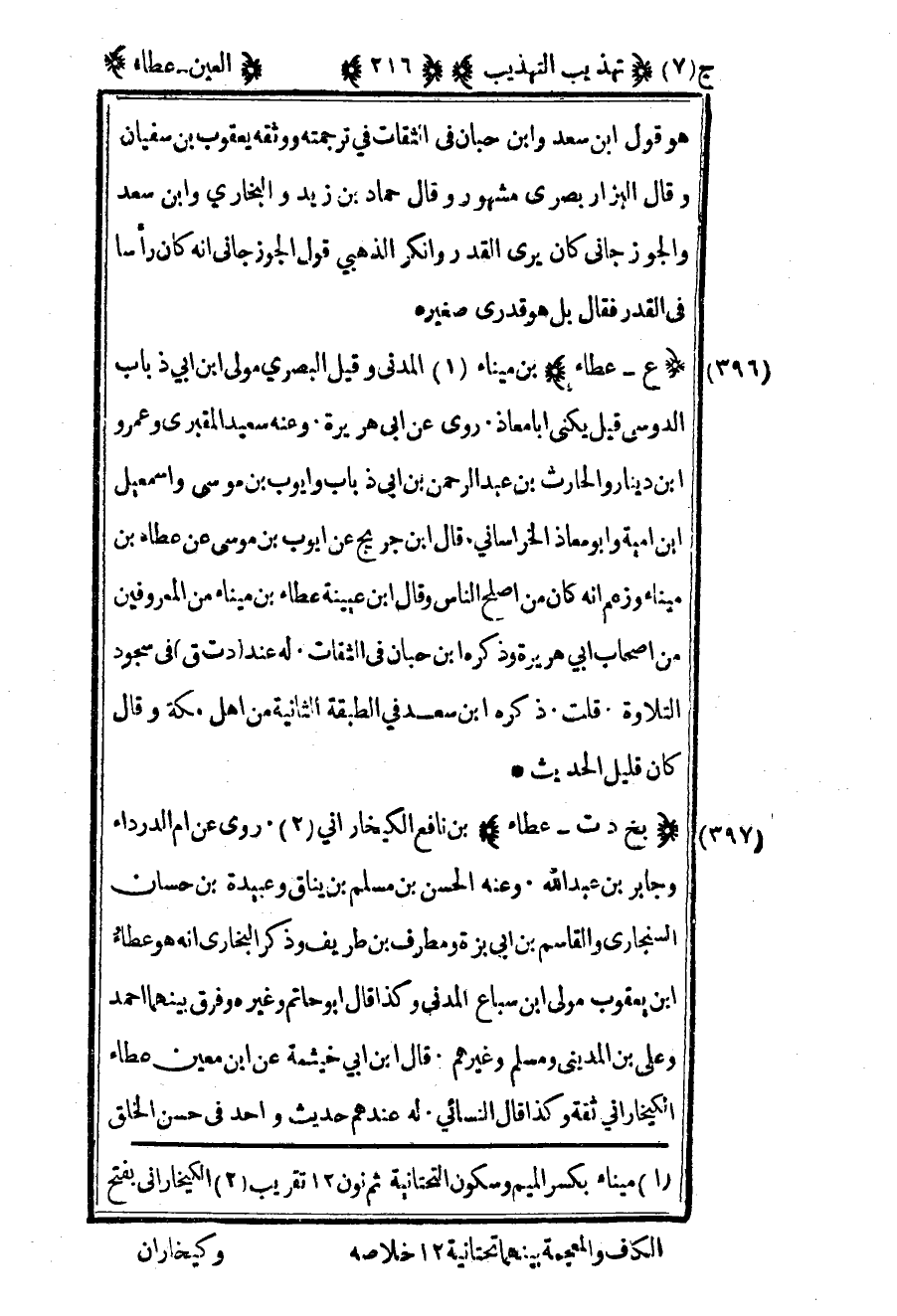 398- "بخ د ت – عطاء" بن نافع الكيخاراني2 روى عن أم الدرداء وجابر بن عبد الله وعنه الحسن بن مسلم بن يناق وعبيدة بن حسان السنجاري والقاسم بن أبي بزة ومطرف بن طريف وذكر البخاري أنه هو عطاء بن يعقوب مولى بن سباع المدني وكذا قال أبو حاتم وغيره وفرق بينهما أحمد وعلي بن المديني ومسلم وغيرهم قال بن أبي خيثمة عن بن معين عطاء الكيخاراني ثقة وكذا قال النسائي له عندهم حديث واحد في حسن الخلق