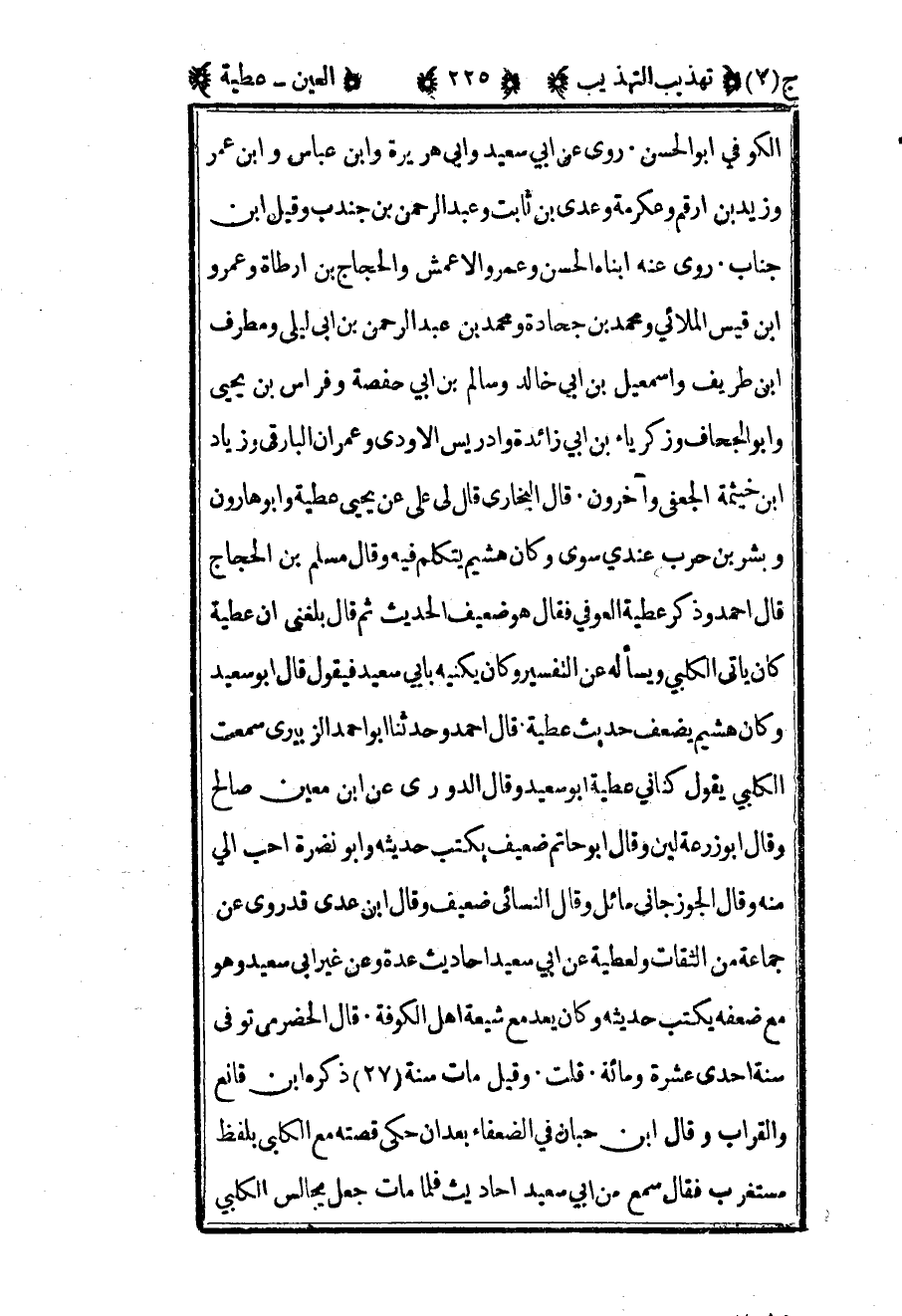 الكوفي أبو الحسن روى عن أبي سعيد وأبي هريرة وابن عباس وابن عمر وزيد بن أرقم وعكرمة وعدي بن ثابت وعبد الرحمن بن جندب وقيل بن جناب روى عنه أبناه الحسن وعمروالأعمش والحجاج بن أرطاة وعمرو بن قيس الملائي ومحمد بن جحادة ومحمد بن عبد الرحمن بن أبي ليلى ومطرف بن طريف وإسماعيل بن أبي خالد وسالم بن أبي حفصة وفراس بن يحيى وأبو الجحاف وزكرياء بن أبي زائدة وإدريس الأودي وعمران البارقي وزياد بن خيثمة الجعفي وآخرون قال البخاري قال لي علي عن يحيى عطية وأبو هارون وبشر بن حرب عندي سوي وكان هشيم يتكلم فيه وقال مسلم بن الحجاج قال أحمد وذكر عطية العوفي فقال هو ضعيف الحديث ثم قال بلغني أن عطية كان يأتي الكلبي ويسأله عن التفسير وكان يكنيه بأبي سعيد فيقول قال أبو سعيد وكان هشيم يضعف حديث عطية قال أحمد وحدثنا أبو أحمد الزبيري سمعت الكلبي يقول كناني عطية أبو سعيد وقال الدوري عن بن معين صالح وقال أبو زرعة لين وقال أبو حاتم ضعيف يكتب حديثه وأبو نضرة أحب إلي منه وقال الجوزجاني مائل وقال النسائي ضعيف وقال بن عدي قد روى عن جماعة من الثقات ولعطية عن أبي سعيد أحاديث عدة وعن غير أبي سعيد وهو مع ضعفه يكتب حديثه وكان يعد مع شيعة أهل الكوفة قال الحضرمي توفي سنة إحدى عشرة ومائة قلت وقيل مات سنة 27 ذكره بن قانع والقراب وقال بن حبان في الضعفاء بعد أن حكى قصته مع الكلبي بلفظ مستغرب فقال سمع من أبي سعيد أحاديث فلما مات جعل يجالس الكلبي