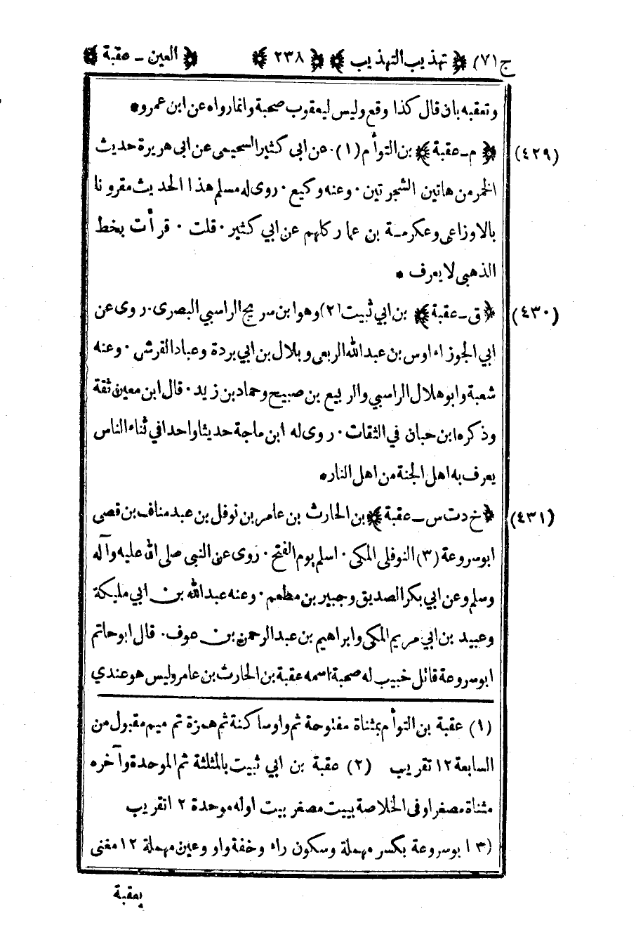 430- "م – عقبة" بن التوأم1 عن أبي كثير السحيمي عن أبي هريرة حديث الخمر من هاتين الشجرتين وعنه وكيع روى له مسلم هذا الحديث مقرونا بالأوزاعي وعكرمة بن عمار كلهم عن أبي كثير قلت قرأت بخط الذهبي لا يعرف