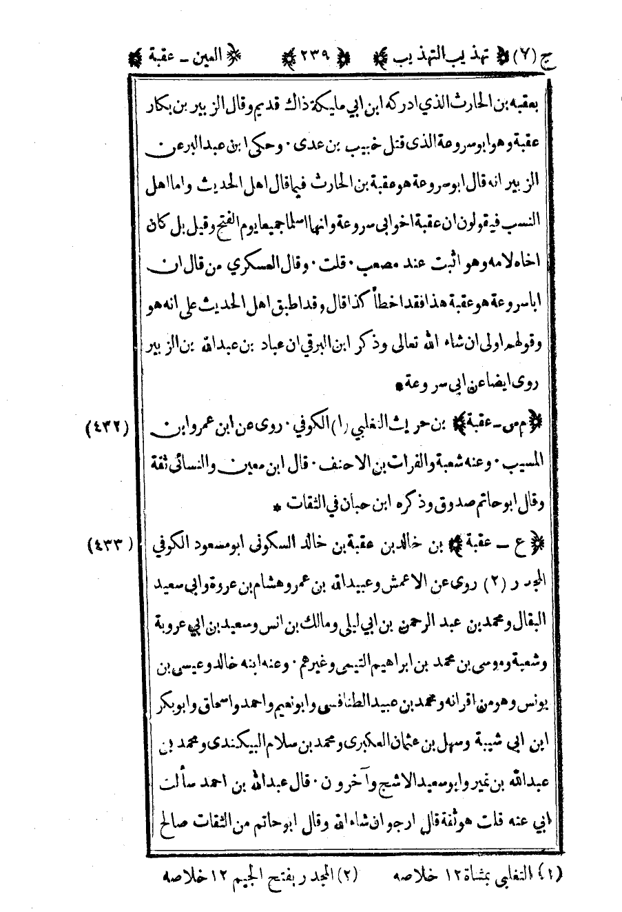 -433 "م س – عقبة" بن حريث التغلبي1 الكوفي روى عن بن عمرو وابن المسيب وعنه شعبة والفرات بن الأحنف قال بن معين والنسائي ثقة وقال أبو حاتم صدوق وذكر بن حبان في الثقات