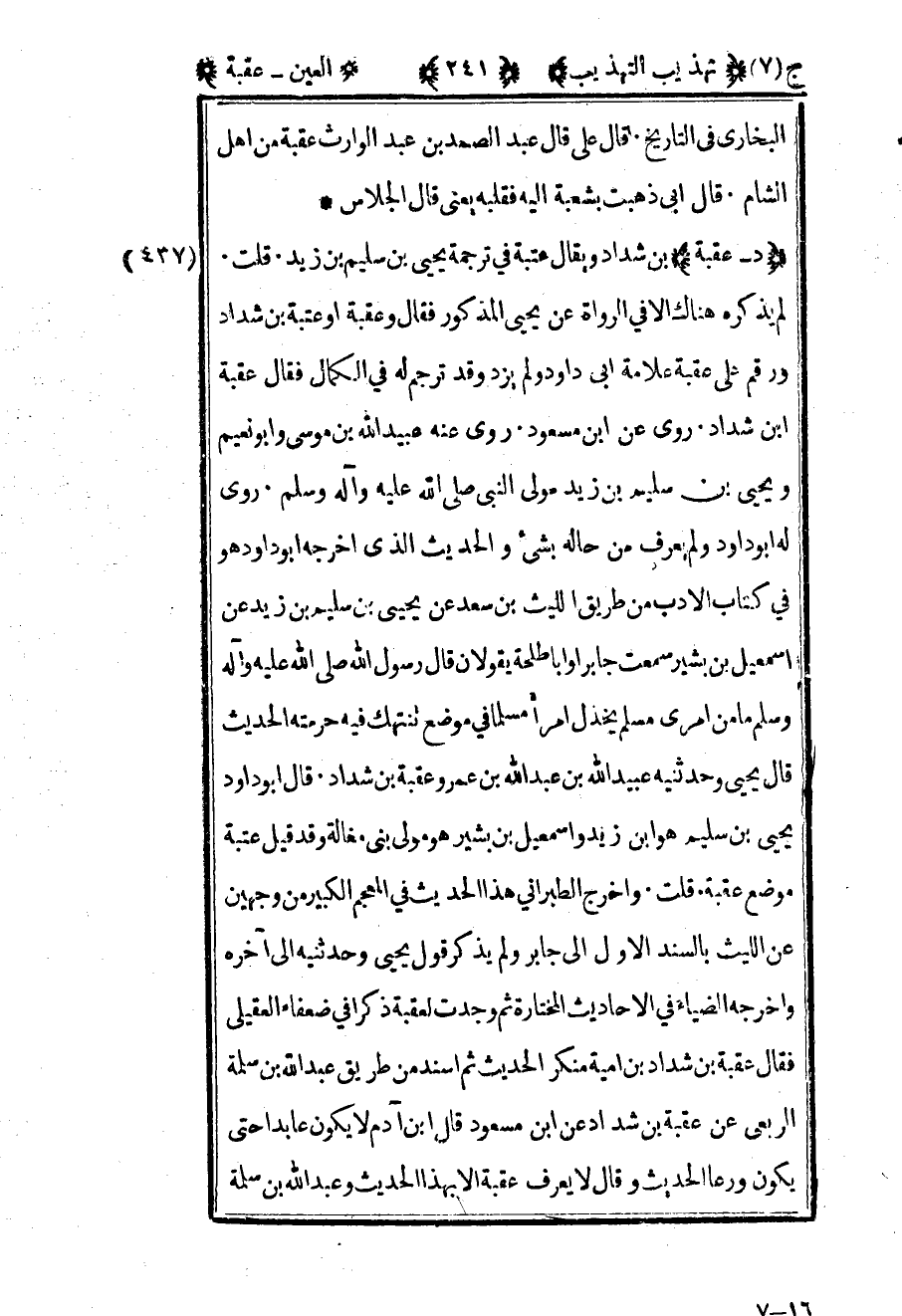 438- "د – عقبة" بن شداد ويقال عتبة في ترجمة يحيى بن سليم بن زيد قلت لم يذكره هناك الا في الرواة عن يحيى المذكور فقال وعقبة أو عتبة بن شداد ورقم على عقبة علامة أبي داود ولم يزد وقد ترجم له في الكمال فقال عقبة بن شداد روى عن بن مسعود روى عنه عبيد الله بن موسى وأبو نعيم ويحيى بن سليم بن زيد مولى النبي صلى الله عليه وسلم روى له أبو داود ولم يعرف من حاله بشيء والحديث الذي أخرجه أبو داود هو في كتاب الأدب في طريق الليث بن سعد عن يحيى بن سليم بن زيد عن إسماعيل بن بشير سمعت جابرا وأبا طلحة يقولان قال رسول الله صلى الله عليه وسلم "ما من امرء مسلم يخذل امرأ مسلما في موضع تنتهك فيه حرمته" الحديث قال يحيى وحدثنيه عبيد الله بن عبد الله بن عمر وعقبة بن شداد قال أبو داود يحيى بن سليم هو بن زيد وإسماعيل بن بشير هو مولى بني مغالة وقد قيل عتبة موضع عقبة قلت وأخرج الطبراني هذا الحديث في المعجم الكبير من وجهين عن الليث بالسند الأول إلى جابر ولم يذكر قول يحيى وحدثنيه إلى آخره وأخرجه الضياء في الأحاديث المختارة ثم وجدت لعقبة ذكرا في ضعفاء العقيلي فقال عقبة بن شداد بن أمية منكر الحديث ثم أسند من طريق عبد الله بن سلمة الربعي عن عقبة بن شداد عن بن مسعود قال بن آدم لا يكون عابدا حتى يكون ورعا الحديث وقال لا يعرف عقبة الا بهذا الحديث وعبد الله بن سلمة