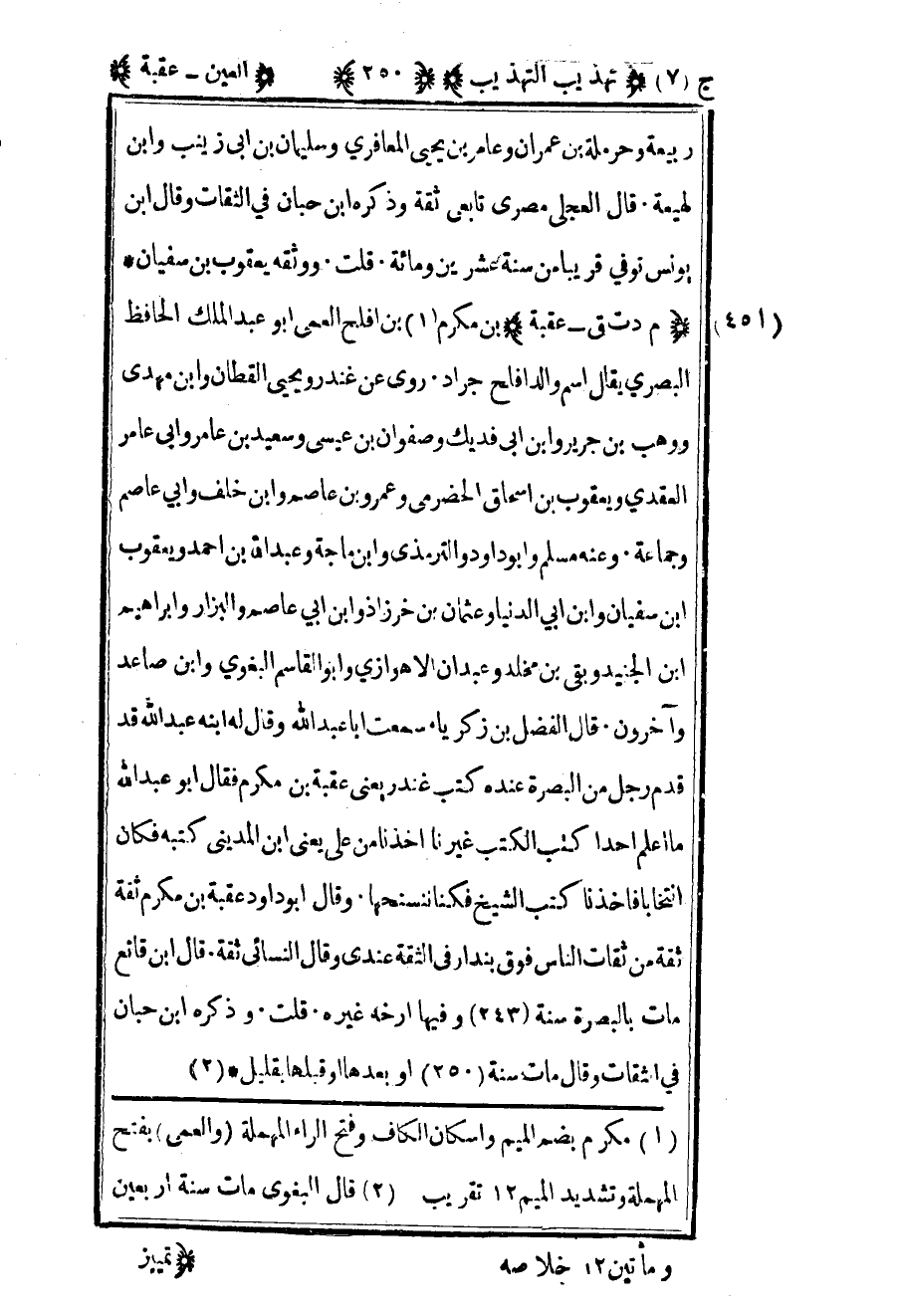 452- "م د ت ق – عقبة" بن مكرم1 بن أفلح العمي أبو عبد الملك الحافظ البصري يقال اسم والد أفلح جراد روى عن غندر ويحيى القطان وابن مهدي ووهب بن جرير وابن أبي فديك وصفوان بن عيسى وسعيد بن عامر وأبي عامر العقدي ويعقوب بن إسحاق الحضرمي وعمرو بن عاصم وابن خلف وأبي عاصم وجماعة وعنه مسلم وأبو داود والترمذي وابن ماجة وعبد الله بن أحمد ويعقوب بن سفيان وابن أبي الدنيا وعثمان بن خرزاذ وابن أبي عاصم والبزار وإبراهيم بن الجنيد وبقي بن مخلد وعبدان الأهوازي وأبو القاسم البغوي وابن صاعد وآخرون قال الفضل بن زكريا سمعت أبا عبد الله وقال له ابنه عبد الله قد قدم رجل من البصرة عنده كتب غندر يعني عقبة بن مكرم فقال أبو عبد الله ما أعلم أحدا كتب الكتب غيرنا أخذنا من علي يعني بن المديني كتبه فكان انتخابا فأخذنا كتب الشيخ فكنا ننسخها وقال أبو داود عقبة بن مكرم ثقة ثقة من ثقات الناس فوق بندار في الثقة عندي وقال النسائي ثقة قال بن قانع مات بالبصرة سنة 243 وفيها أرخه غيره قلت وذكره بن حبان في الثقات وقال مات سنة 25 أو بعدها أو قبلها بقليل2