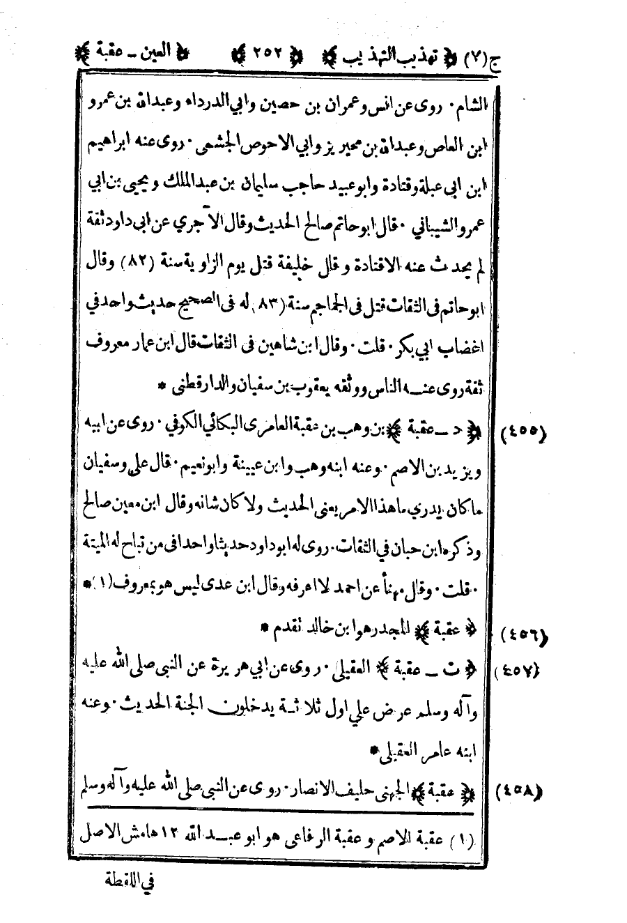 458- "ت – عقبة" العقلي روى عن أبي هريرة عن النبي صلى الله عليه وسلم عرض علي أول ثلاثة يدخلون الجنة الحديث وعنه ابنه عامر العقيلي