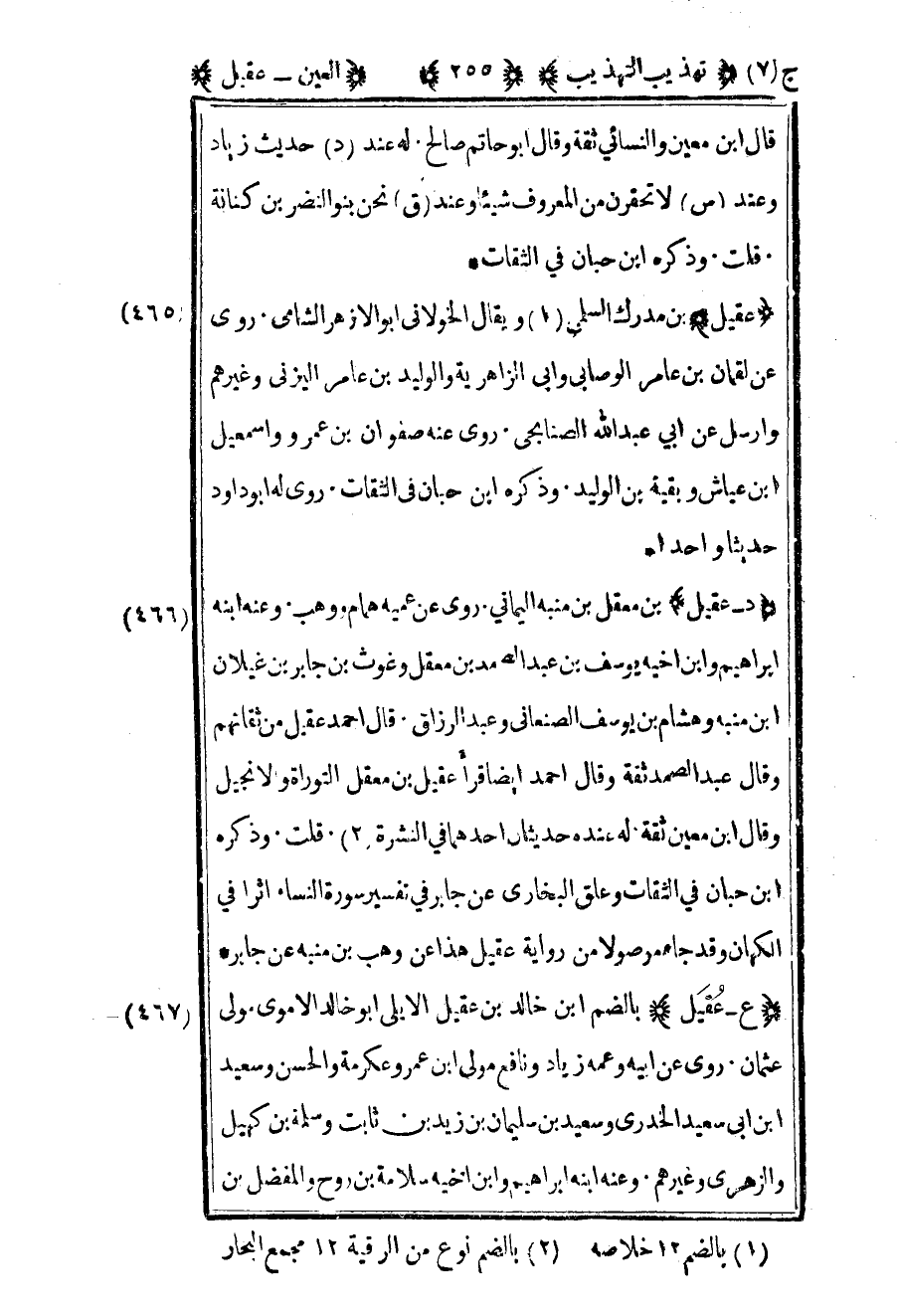 -467 "د عقيل" بن معقل بن منبه اليماني روى عن عميه همام ووهب وعنه ابنه إبراهيم وابن أخيه يوسف بن عبد الصمد بن معقل وغوث بن جابر بن غيلان بن منبه وهشام بن يوسف الصنعاني وعبد الرزاق قال أحمد عقيل من ثقاتهم وقال عبد الصمد ثقة وقال أحمد أيضا قرأ عقيل بن معقل التوراة والإنجيل وقال بن معين ثقة له عنده حديثان أحدهما في النشرة2 قلت وذكره بن حبان في الثقات وعلق البخاري عن جابر في تفسير سورة النساء أثرا في الكهان وقد جاء موصولا من رواية عقيل هذا عن وهب بن منبه عن جابر