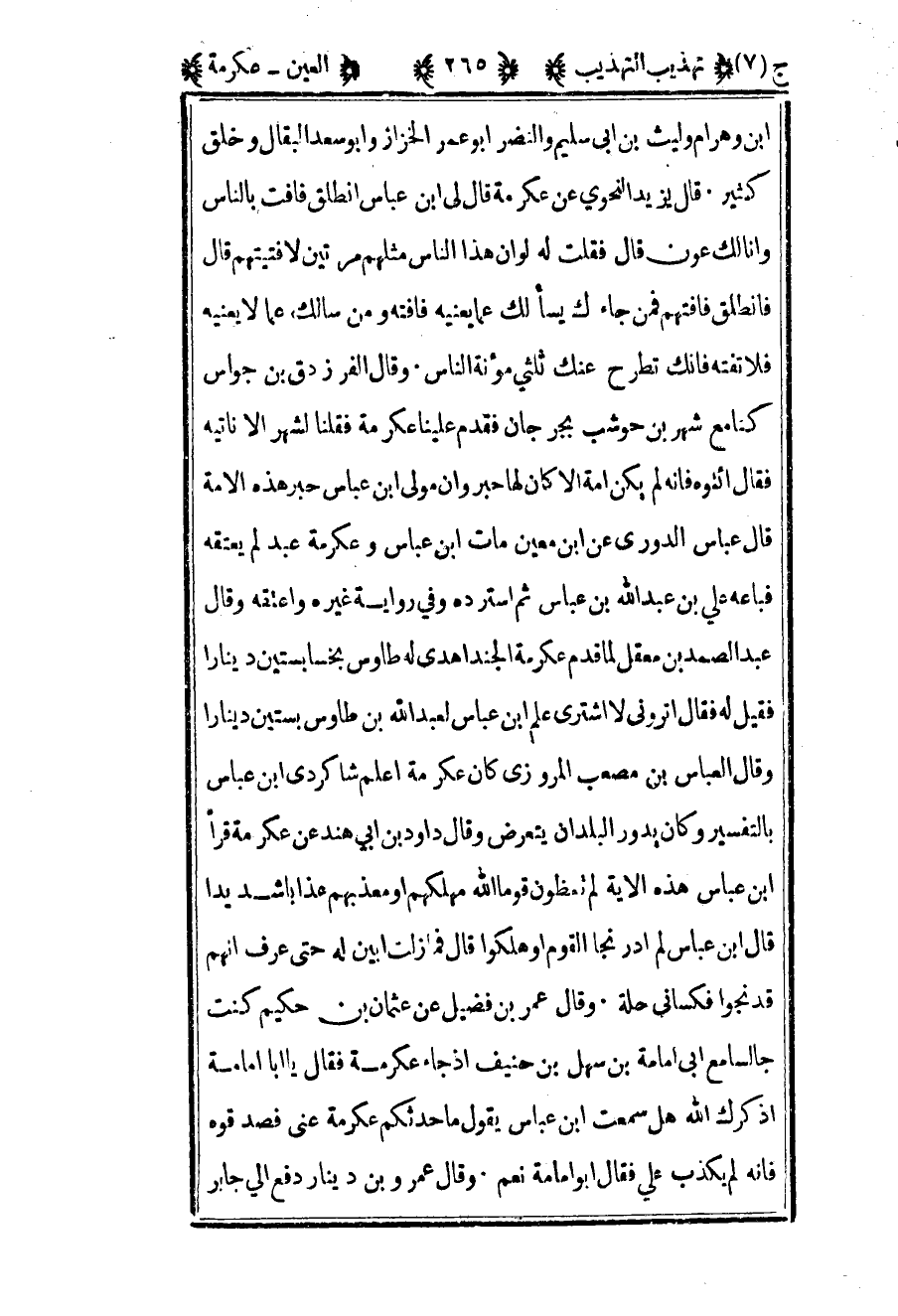 ابن وهرام وليث بن أبي سليم والنضر أبو عمر الخزاز وأبو سعيد البقال وخلق كثير قال يزيد النحوي عن عكرمة قال لي بن عباس انطلق فافت بالناس وأنا لك عون قال فقلت له لو أن هذا الناس مثلهم مرتين لأفتيتهم قال فانطلق فافتهم فمن جاءك يسألك عما يعنيه فافته ومن سألك عما لا يعنيه فلا تفته فإنك تطرح عنك ثلاثي مؤنة الناس وقال الفرزدق بن جواس كنا مع شهر بن حوشب بجرجان فقدم علينا عكرمة فقلنا لشهر ألا ناتيه فقال ائتوه فإنه لم يكن أمة الا كان لها حبر وأن مولى بن عباس حبر هذه الأمة