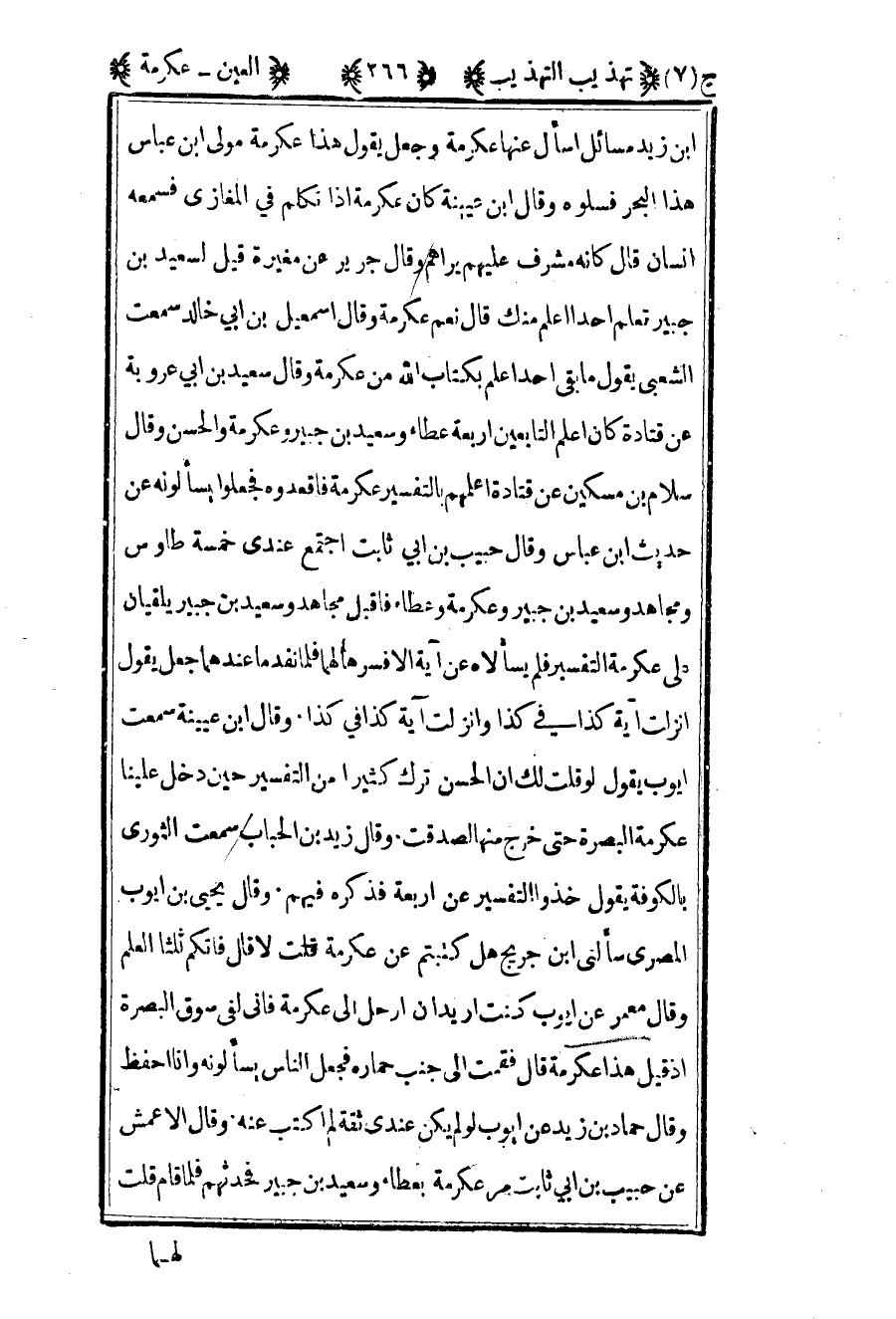 ابن زيد مسائل أسأل عنها عكرمة وجعل يقول هذا عكرمة مولى بن عباس هذا البحر فسلوه وقال بن عيينة كان عكرمة إذا تكلم قي المغازي فسمعه إنسان قال كأنه مشرف عليهم يراهم وقال جرير عن مغيرة قيل لسعيد بن جبير تعلم أحدا أعلم منك قال نعم عكرمة وقال إسماعيل بن أبي خالد سمعت الشعبي يقول ما بقي أحد أعلم بكتاب الله من عكرمة وقال سعيد بن أبي عروبة عن قتادة كان أعلم التابعين أربعة عطاء وسعيد بن جبير وعكرمة والحسن وقال سلام بن مسكين عن قتادة أعلمهم بالتفسير عكرمة فاقعدوه فجعلوا يسألونه عن حديث بن عباس وقال حبيب بن أبي ثابت اجتمع عندي خمسة طاوس ومجاهد وسعيد بن جبير وعكرمة وعطاء فأقبل مجاهد وسعيد بن جبير يلقيان على عكرمة التفسير فلم يسألاه عن آية الا فسرها لهما فلما نفد ما عندهما جعل يقول أنزلت آية كذا في كذا وأنزلت آية كذا في كذا وقال بن عيينة سمعت أيوب يقول لو قلت لك أن الحسن ترك كثيرا من التفسير حين دخل علينا عكرمة البصرة حتى خرج منها لصدقت وقال زيد بن الحباب سمعت الثوري بالكوفة يقول خذوا التفسير عن أربعة فذكره فيهم