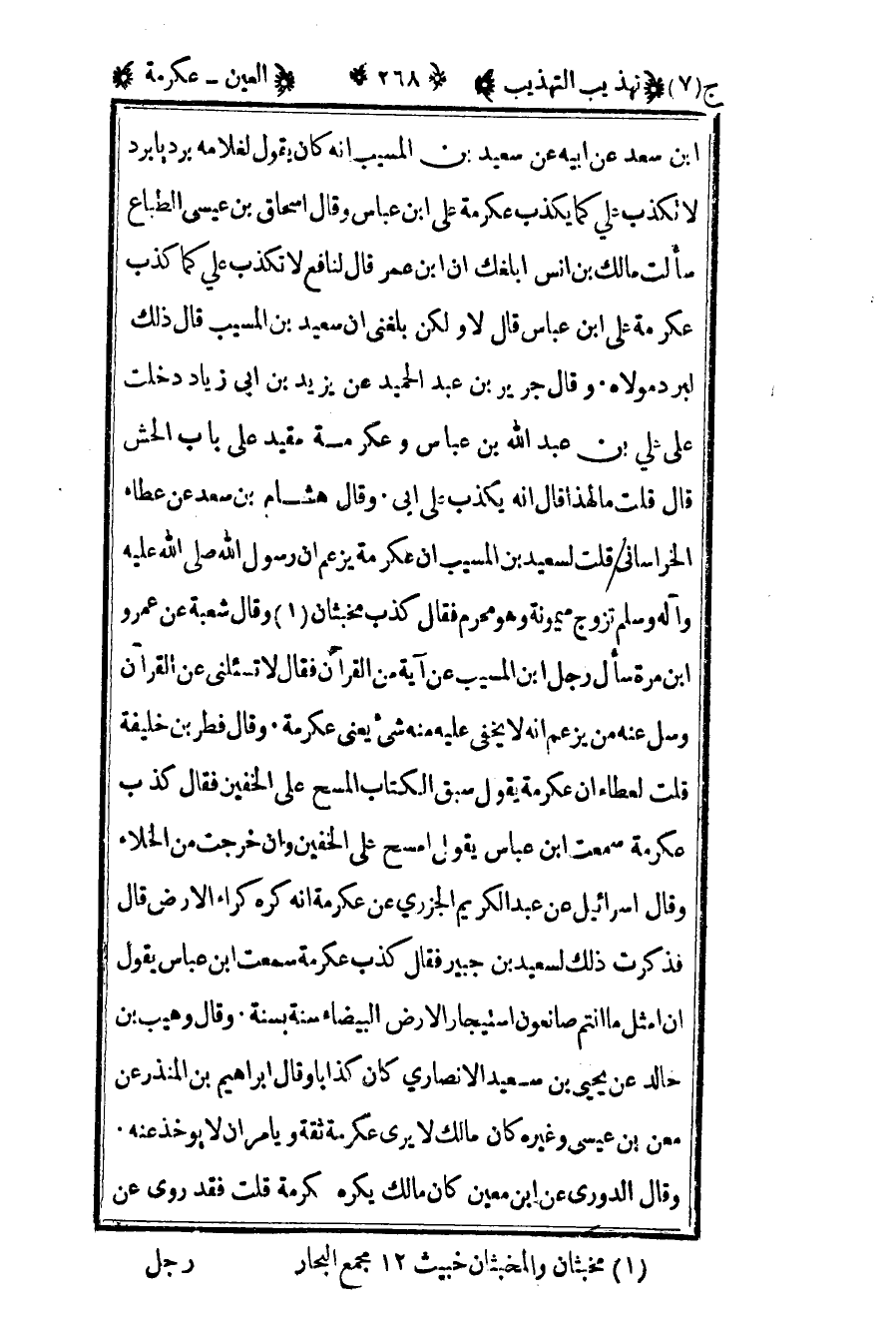 ابن سعد عن أبيه عن سعيد بن المسيب أنه كان يقول لغلامه برد يا برد لا تكذب علي كما يكذب عكرمة على بن عباس وقال إسحاق بن عيسى الطباع سألت مالك بن أنس أبلغك أن بن عمر قال لنافع لا تكذب علي كما كذب عكرمة على بن عباس قال لاولكن بلغني أن سعيد بن المسيب قال ذلك لبرد مولاه وقال جرير بن عبد الحميد عن يزيد بن أبي زياد دخلت على علي بن عبد الله بن عباس وعكرمة مقيد على باب الحش قال قلت ما لهذا قال إنه يكذب على أبي وقال هشام بن سعد عن عطاء الخراساني قلت لسعيد بن المسيب أن عكرمة يزعم أن رسول الله صلى الله عليه وسلم تزوج ميمونة وهو محرم فقال كذب مخبثان1 وقال شعبة عن عمرو بن مرة سأل رجل بن المسيب عن آية من القرآن فقال لا تسألني عن القرآن وسل عنه من يزعم أنه لا يخفي عليه منه شيء يعني عكرمة وقال فطر بن خليفة قلت لعطاء أن عكرمة يقول سبق الكتاب المسح على الخفين فقال كذب عكرمة سمعت بن عباس يقول أمسح على الخفين وأن خرجت من الخلاء وقال إسرائيل عن عبد الكريم الجزري عن عكرمة أنه كره كراء الأرض قال فذكرت ذلك لسعيد بن جبير فقال كذب عكرمة سمعت بن عباس يقول إن أمثل ما أنتم صانعون استيجار الأرض البيضاء سنة بسنة وقال وهيب بن خالد عن يحيى بن سعيد الأنصاري كان كذابا وقال إبراهيم بن المنذر عن معن بن عيسى وغيره كان مالك لا يرى عكرمة ثقة ويأمر أن لا يؤخذ عنه وقال الدوري عن بن معين كان مالك يكره عكرمة قلت فقد روى عن