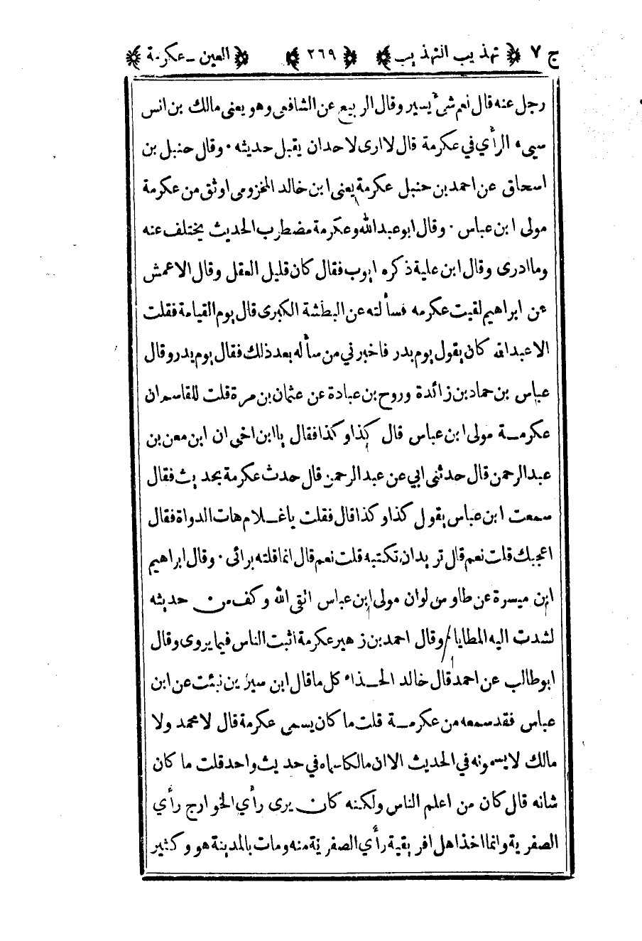 رجل عنه قال نعم شيء يسير وقال الربيع عن الشافعي وهو يعني مالك بن أنس سيء الرأي في عكرمة قال لا أري لأحد أن يقبل حديثه وقال حنبل بن إسحاق عن أحمد بن حنبل عكرمة يعني بن خالد المخزومي أوثق من عكرمة مولى بن عباس وقال أبو عبد الله وعكرمة مضطرب الحديث يختلف عنه وما أدري وقال بن علية ذكره أيوب فقال كان قليل العقل وقال الأعمش عن إبراهيم لقيت عكرمة فسألته عن البطشة الكبرى قال يوم القيامة فقلت الا عبد الله كان يقول يوم بدر فأخبرني من أسأله بعد ذلك فقال يوم بدر وقال عباس بن حماد بن زائدة وروح بن عبادة عن عثمان بن مرة قلت للقاسم إن عكرمة مولى بن عباس قال كذا وكذا فقال يا بن أخي أن بن معن بن عبد الرحمن قال حدثني أبي عن عبد الرحمن قال حدث عكرمة بحديث فقال سمعت بن عباس يقول كذا وكذا قال فقلت يا غلام هات الدواة فقال أعجبك قلت نعم قال تريد أن تكتبه قلت نعم قال إنما قلته برأيي وقال إبراهيم بن ميسرة عن طاوس لو أن مولى بن عباس اتقى الله وكف من حديثه لشدت إليه المطايا وقال أحمد بن زهير عكرمة أثبت الناس فيما يروي وقال أبو طالب عن أحمد قال خالد الحذاء كل ما قال بن سيرين نبئت عن بن عباس فقد سمعه من عكرمة قلت ما كان يسمى عكرمة قال لا محمد ولا مالك لا يسمونه في الحديث الا أن مالكا سماه في حديث واحد قلت ما كان شأنه قال كان من أعلم الناس ولكنه كان يرى رأي الخوارج رأي الصفرية وإنما أخذ أهل إفريقية رأي الصفرية منه ومات بالمدينة هو وكثير
