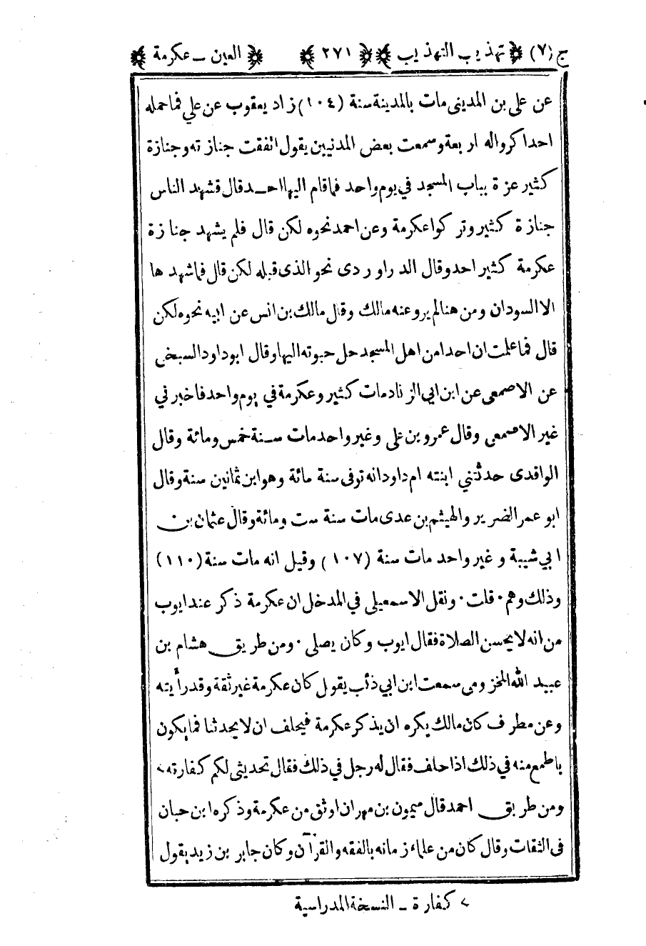 عن علي بن المديني مات بالمدينة سنة 104 زاز يعقوب عن علي فما حمله أحد أكروا له أربعة وسمعت بعض المدنيين يقول اتفقت جنازته وجنازة كثير عزة بباب المسجد في يوم واحد فما قام إليها أحد قال فشهد الناس جنازة كثير وتركوا عكرمة وعن أحمد نحوه لكن قال فلم يشد جنازة عكرمة كثير أحد وقال الدراوردي نحو الذي قبله لكن قال فما شهدها الا السودان ومن هنا لم يرو عنه مالك وقال مالك بن أنس عن أبيه نحوه لكن قال فما علمت أن أحدا من أهل المسجد حل حبوته إليها وقال أبو داود السبخي عن الأصمعي عن بن أبي الزناد مات كثير وعكرمة في يوم واحد فأخبرني عن الأصمعي وقال عمرو بن علي وغير واحد مات سنة خمس ومائة وقال الواقدي حدثتني ابنته أم داود أنه توفي سنة مائة وهو بن ثمانين سنة وقال أبو عمر الضرير والهيثم بن عدي مات سنة ست ومائة وقال عثمان بن أبي شيبة وغير واحد مات سنة 107 وقيل أنه مات سنة 11 وذلك وهم قلت ونقل الإسماعيلي في المدخل أن عكرمة ذكر عند أيوب من أنه لا يحسن الصلاة فقال أيوب وكان يصلي ومن طريق هشام بن عبيد الله المخزومي سمعت بن أبي ذئب يقول كان عكرمة غير ثقة وقد رأيته وعن مطرف كان مالك يكره أن يذكر عكرمة فيحلف أن لا يحدثنا فما يكون بأطمع منه في ذلك إذا حلف فقال له رجل في ذلك فقال تحديثي لكم كفارته1 ومن طريق أحمد قال ميمون بن مهران أوثق من عكرمة وذكره بن حبان في الثقات وقال كان من علماء زمانه بالفقه والقرآن وكان جابر بن زيد يقول