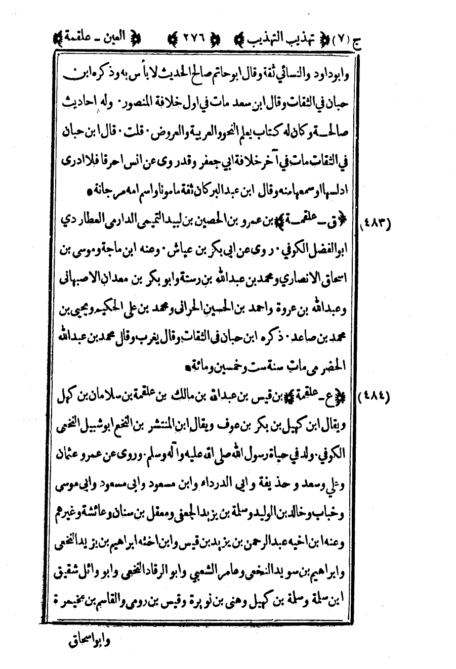 485- "ع – علقمة" بن قيس بن عبد الله بن مالك بن علقمة بن سلامان بن كهل ويقال بن كهيل بن بكر بن عوف ويقال بن المنتشر بن النخع أبو شبيل النخعي الكوفي ولد في حياة رسول الله صلى الله عليه وسلم وروى عن عمر وعثمان وعلي وسعد وحذيفة وأبي الدرداء وابن مسعود وأبي مسعود وأبي موسى وخباب وخالد بن الوليد وسلمة بن يزيد الجعفي ومعقل بن سنان وعائشة وغيرهم وعنه بن أخيه عبد الرحمن بن يزيد بن قيس وابن أخته إبراهيم بن يزيد النخعي وإبراهيم بن سويد النخعي وعامر الشعبي وأبو الرقاد النخعي وأبو وائل شقيق بن سلمة وسلمة بن كهيل وهنى بن نويرة وقيس بن رومي والقاسم بن مخيمرة