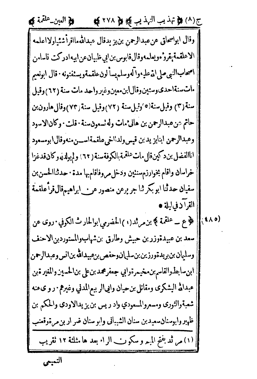 486- "ع – علقمة" بن مرثد1 الحضرمي أبو الحارث الكوفي روى عن سعد بن عبيدة وزر بن حبيش وطارق بن شهاب والمستورد بن الأحنف وسليمان بن بريدة ورزين بن سليمان وحفص بن عبيد الله بن أنس وعبد الرحمن بن سابط والقاسم بن مخيمرة وأبي جعفر محمد بن علي بن الحسين والمغيرة بن عبد الله اليشكري ومقاتل بن حيان وأبي الربيع المدني وغيرهم روى عنه شعبة والثوري ومسعر والمسعودي وإدريس بن يزيد الأودي والحكم بن ظهير وأبو سنان سعيد بن سنان الشيباني وأبو سنان ضرار بن مرة وقعنب