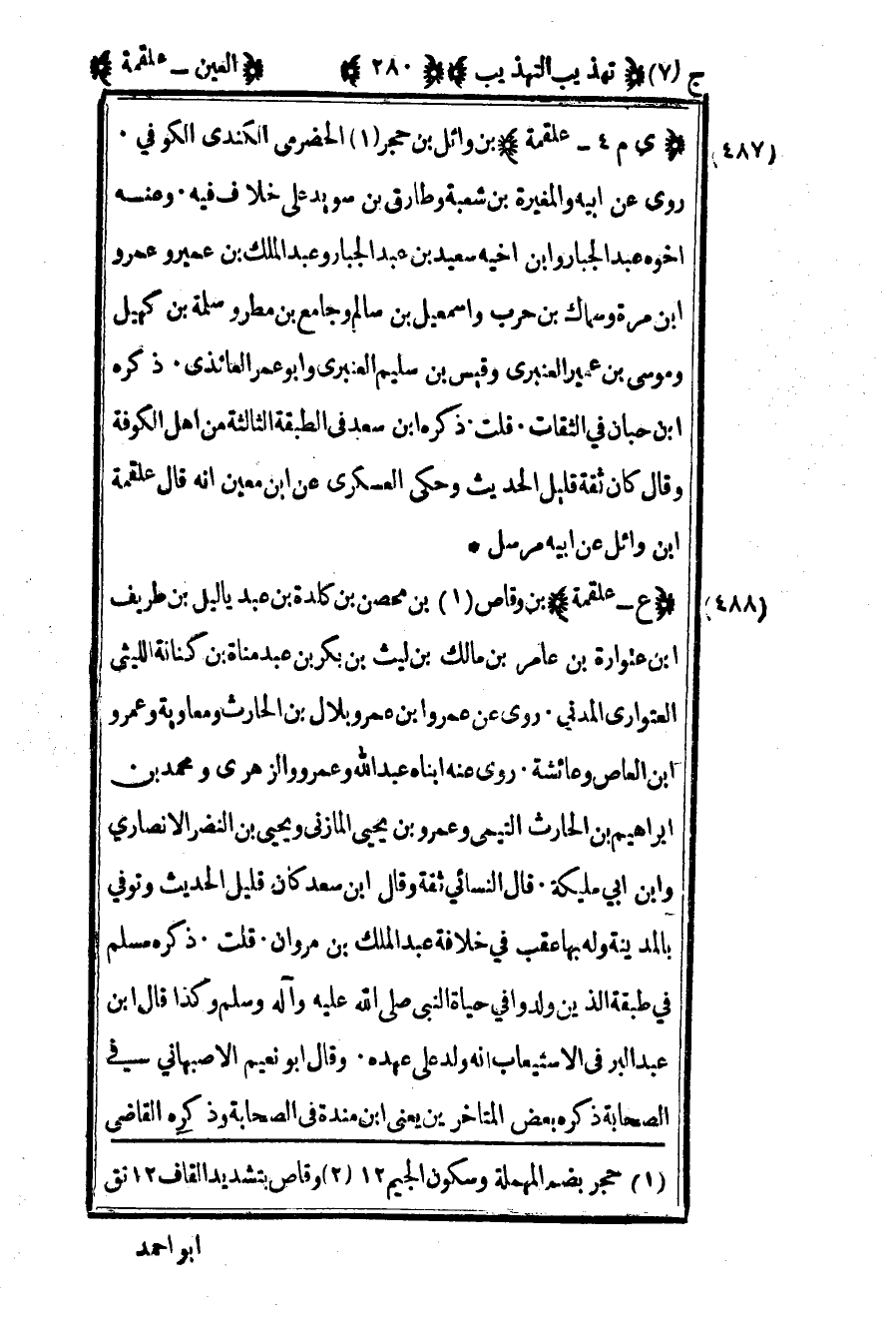 488- "ي م 4 – علقمة" بن وائل بن حجر1 الحضرمي الكندي الكوفي روى عن أبيه والمغيرة بن شعبة وطارق بن سويد على خلاف فيه وعنه أخوه عبد الجبار وابن أخيه سعيد بن عبد الجبار وعبد الملك بن عمير وعمرو بن مرة وسماك بن حرب وإسماعيل بن سالم وجامع بن مطر وسلمة بن كهيل وموسى بن عمير العنبري وقيس بن سليم العنبري وأبو عمر العائذي ذكره بن حبان الثقات قلت ذكره بن سعد في الطبقة الثالثة من أهل الكوفة وقال كان ثقة قليل الحديث وحكى العسكري عن بن معين أنه قال علقمة بن وائل عن أبيه مرسل