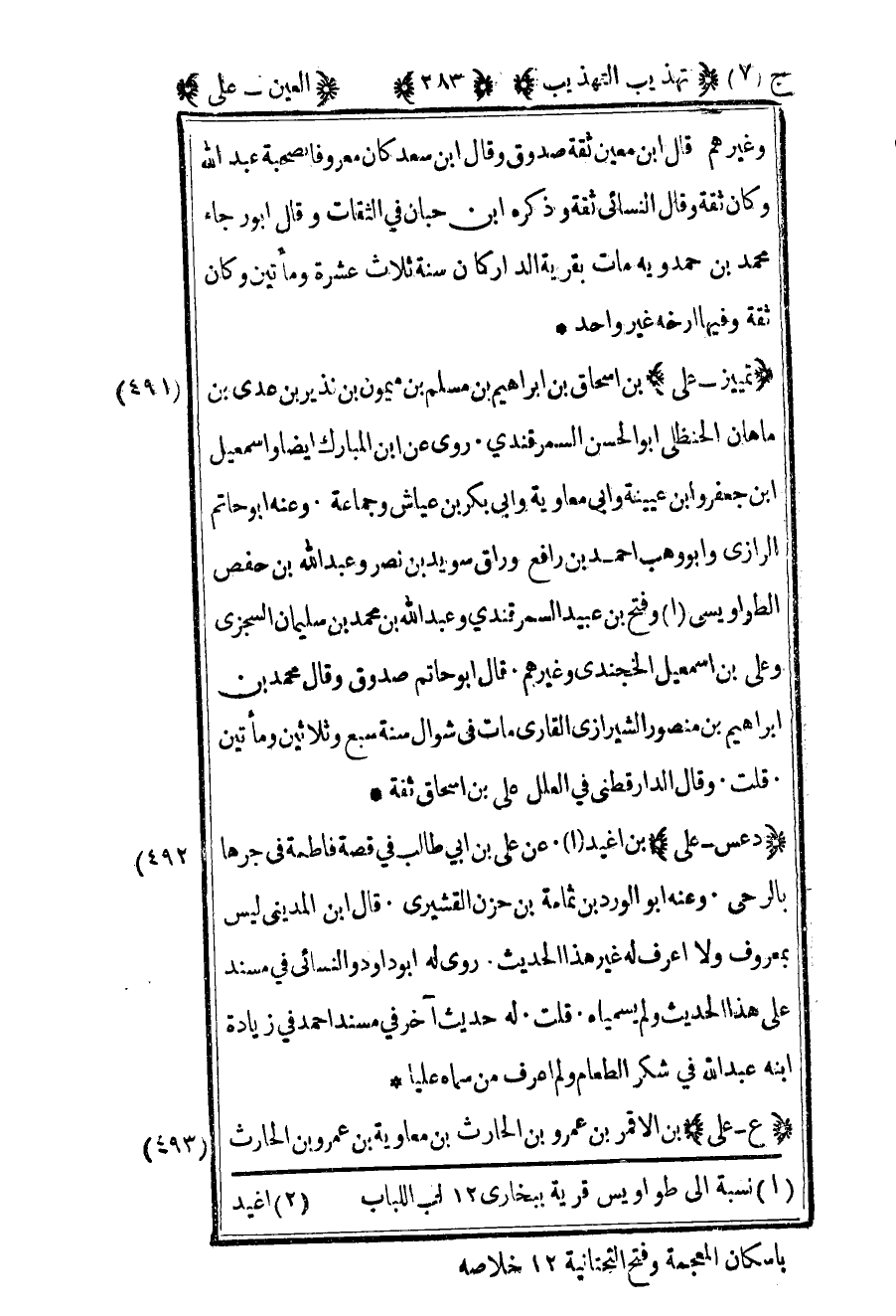 -492 "تمييز – علي" بن إسحاق بن إبراهيم بن مسلم بن ميمون بن نذير بن عدي بن ماهان الحنظلي أبو الحسن السمرقندي روى عن بن المبارك أيضا وإسماعيل بن جعفر وابن عيينة وأبي معاوية وأبي بكر بن عياش وجماعة وعنه أبو حاتم الرازي وأبو وهب أحمد بن رافع وراق سويد بن نصر وعبد الله بن حفص الطواويسي1 وفتح بن عبيد السمرقندي وعبد الله بن محمد بن سليمان السجزي وعلي بن إسماعيل الخجندي وغيرهم قال أبو حاتم صدوق وقال محمد بن إبراهيم بن منصور الشيرازي القاري مات في شوال سنة سبع وثلاثين ومائتين قلت وقال الدارقطني في العلل علي بن إسحاق ثقة
