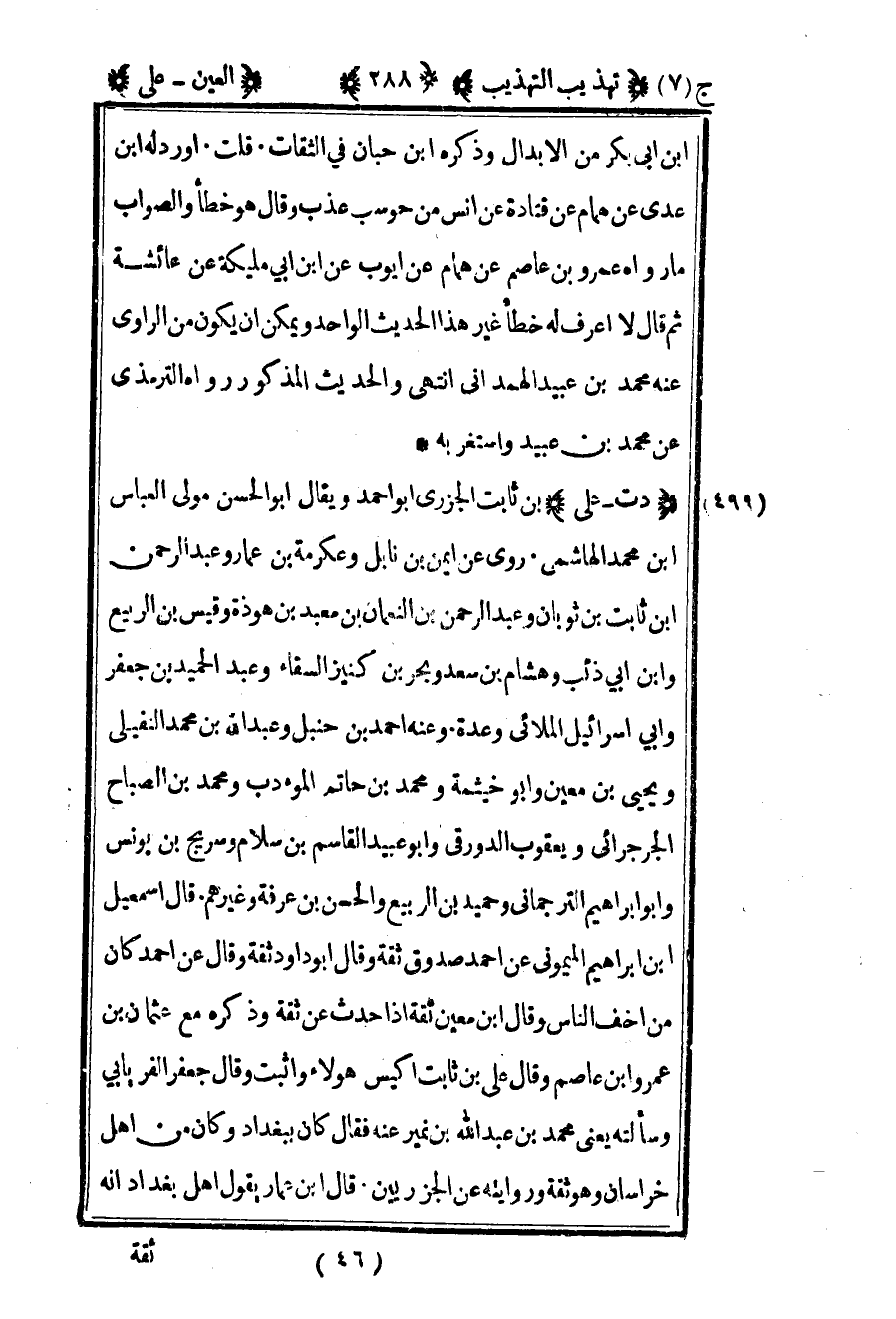 500- "د ت – علي" بن ثابت الجزري أبو أحمد ويقال أبو الحسن مولى العباس بن محمد الهاشمي روى عن أيمن بن نابل وعكرمة بن عمار وعبد الرحمن بن ثابت بن ثوبان وعبد الرحمن بن النعمان بن معبد بن هوذة وقيس بن الربيع وابن أبي ذئب وهشام بن سعد وبحر بن كنيز السقاء وعبد الحميد بن جعفر وأبي إسرائيل الملائي وعدة وعنه أحمد بن حنبل وعبد الله بن محمد النفيلي ويحيى بن معين وأبو خيثمة ومحمد بن حاتم المؤدب ومحمد بن الصباح الجرجرائي ويعقوب الدورقي وأبو عبيد القاسم بن سلام وسريج بن يونس وأبو إبراهيم الترجماني وحميد بن الربيع والحسن بن عرفة وغيرهم قال إسماعيل بن إبراهيم الميموني عن أحمد صدوق ثقة وقال أبو داود ثقة وقال عن أحمد كان من أخف الناس وقال بن معين ثقة إذا حدث عن ثقة وذكره مع عثمان بن عمرو بن عاصم وقال علي بن ثابت أكيس هؤلاء وأثبت وقال جعفر الفريابي وسألته يعني محمد بن عبد الله بن نمير عنه فقال كان ببغداد وكان من أهل خراسان وهو ثقة وروايته عن الجزريين قال بن عمار يقول أهل بغداد أنه