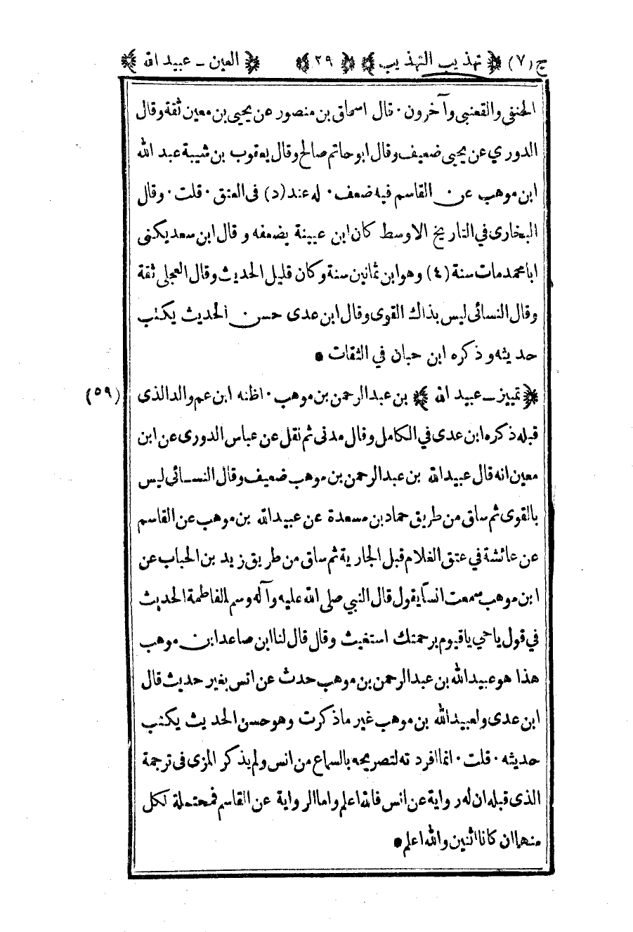 59- "تمييز - عبيد الله" بن عبد الرحمن بن موهب أظنه بن عم والد الذي قبله ذكره بن عدي في الكامل وقال مدني ثم نقل عن عباس الدوري عن بن معين أنه قال عبيد الله بن عبد الرحمن بن موهب ضعيف وقال النسائي ليس بالقوي ثم ساق من طريق حماد بن مسعدة عن عبيد الله بن موهب عن القاسم عن عائشة في عتق الغلام قبل الجارية ثم ساق من طريق زيد بن الحباب عن بن وهب سمعت أنسا يقول قال النبي صلى الله عليه وسلم لفاطمة الحديث في قول يا حي يا قيوم برحمتك استغيث وقال قال لنا بن صاعد بن موهب هذا هو عبيد الله بن عبد الرحمن بن موهب حدث عن أنس بغير حديث قال بن عدي ولعبيد الله بن موهب غير ما ذكرت وهو حسن الحديث يكتب حديثه قلت إنما أفردته لتصريحه بالسماع من أنس ولم يذكر المزي في ترجمة الذي قبله أن له رواية عن أنس فالله أعلم وأما الرواية عن القاسم فمحتملة لكل منهما أن كانا اثنين والله أعلم