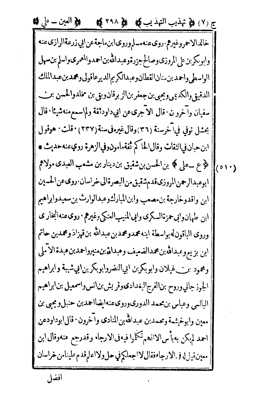 511- "ع – علي" بن الحسن بن شقيق بن دينار بن مشعب العبدي مولاهم أبو عبد الرحمن المروزي قدم شقيق من البصرة إلى خراسان روى عن الحسين بن واقد وخارجة بن مصعب وابن المبارك وعبد الوارث بن سعيد وإبراهيم بن طهمان وأبي حمزة السكري وأبي المنيب العتكي وغيرهم روى عنه البخاري وروى الباقون له بواسطة ابنه محمد ومحمد بن عبد الله بن قهزاد ومحمد بن حاتم بن بزيع وعبد الله بن محمد الضعيف وعبد الله بن منير وأحمد بن عبدة الآملي ومحمود بن غيلان وأبو بكر بن أبي النضر وأبو بكر بن أبي شيبة وإبراهيم الجوزجاني وروح بن الفرج البغدادي وقريش بن أنس وإسماعيل بن إبراهيم البالسي وعباس بن محمد الدوري وروى عنه أيضا أحمد بن حنبل ويحيى بن معين وأبو خيثمة ومحمد بن عبد الله بن المنادي وآخرون قال أبو داود عن أحمد لم يكن به بأس الا أنهم تكلموا فيه في الإرجاء وقد رجع عنه وقال بن معين قيل له في الإرجاء فقال لا أجعلكم في حل ولا أعلم قدم علينا من خراسان