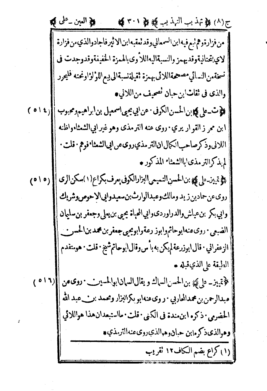 515-" ت – علي" بن الحسن الكوفي عن أبي يحيى إسماعيل بن إبراهيم ومحبوب بن محرز القواريري روى عنه الترمذي وهو غير أبي الشعثاء وأظنه اللاني وذكر صاحب الكمال أن الترمذي روى عن أبي الشعثاء فوهم قلت لم يذكر الترمذي أبا الشعثاء المذكور