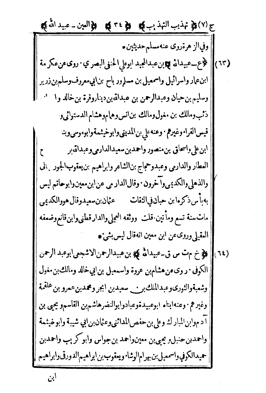 64- "خ م ت س ق - عبيد الله" بن عبيد الرحمن الأشجعي أبو عبد الرحمن الكوفي روى عن هشام بن عروة وإسماعيل بن أبي خالد ومالك بن مغول وشعبة والثوري وعبد الملك بن سعيد بن أبجر ومحمد بن عمرو بن علقمة وغيرهم وعنه ابناه أبو عبيدة وعباد وأبو النضر هاشم بن القاسم ويحيى بن آدم وابن المبارك وعلي بن حفص المدائني وعثمان بن أبي شيبة وأبو خيثمة وأحمد بن حنبل ويحيى بن معين وأحمد بن جواس وأبو كريب وأحمد بن حميد الكوفي وإسماعيل بن بهرام الوشاء ويعقوب بن إبراهيم الدورقي وإبراهيم