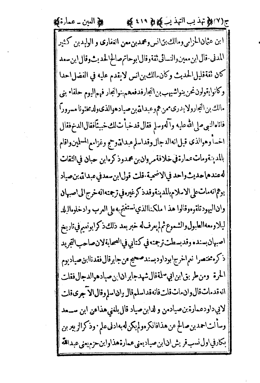 ابن عثمان الحزامي ومالك بن أنس ومحمد بن معن الغفاري والوليد بن كثير المدني قال بن معين والنسائي ثقة وقال أبو حاتم صالح الحديث وقال بن سعد كان ثقة قليل الحديث وكان مالك بن أنس لا يقدم عليه في الفضل أحدا وكانوا يقولون نحن بنوا شهيب بن النجار فدفعهم بنو النجار فهم اليوم حلفاء بني مالك بن النجار ولا يدري ممن هم وعبد الله بن صياد هو الذي ولد مختونا مسرورا فأتاه النبي صلى الله عليه وسلم فقال قد خبأت لك خبيئا فقال الدخ فقال اخسأ وهو الذي قيل أنه الدجال وقد أسلم عبد الله وحج وغزا مع المسلمين وأقام بالمدينة ومات عمارة في خلافة مروان بن محمد وذكره بن حبان في الثقات له عندهما حديث واحد في الأضحية قلت قول بن سعد في عبد الله بن صياد يوهم أنه مات على الإسلام بالمدينة وقد ذكر غيره في ترجمته أنه خرج إلى أصبهان وأن اليهود تلقوه وقالوا هذا ملكنا الذي نستفتح به على العرب وأدخلوه البلد ليلا ومعه الطبول والشموع ثم لم يعرف له خبر بعد ذلك ذكر أبو نعيم في تاريخ أصبهان بسنده وقد بسطت ترجمته في كتابي في الصحابة لأن صاحب التجريد ذكره مختصرا نعم أخرج أبو داود بسند صحيح عن جابر قال فقدنا بن صياد يوم الحرة ومن طريق بن أبي سلمة قال شهد جابر أن بن صياد هو الدجال فقلت أنه قد مات قال وإن مات قلت فإنه قد أسلم قال وإن أسلم وقال الآجري قلت لأبي داود عمارة بن صياد من ولد بن صياد قال بلغني هذا عن بن سعد وسألت أحمد بن صالح عن هذا فأنكره ولم يكن له به أدنى علم وذكر الزبير بن بكار في أول نسب قريش أن بن صياد يعني عمارة هذا وابن حزم يعني عبد الله