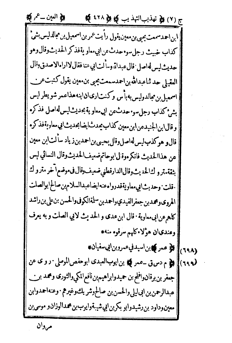 699- "م د س ق – عمر" بن أيوب العبدي أبو حفص الموصلي روى عن جعفر بن برقان وأفلح بن حميد وإبراهيم بن نافع المكي والثوري ومحمد بن عبد الرحمن بن أبي ليلى والحسن بن صالح وشريك وغيرهم وعنه أحمد وابن معين وداود بن رشيد وأبو بكر بن أبي شيبة وأيوب بن محمد الوزان وموسى بن