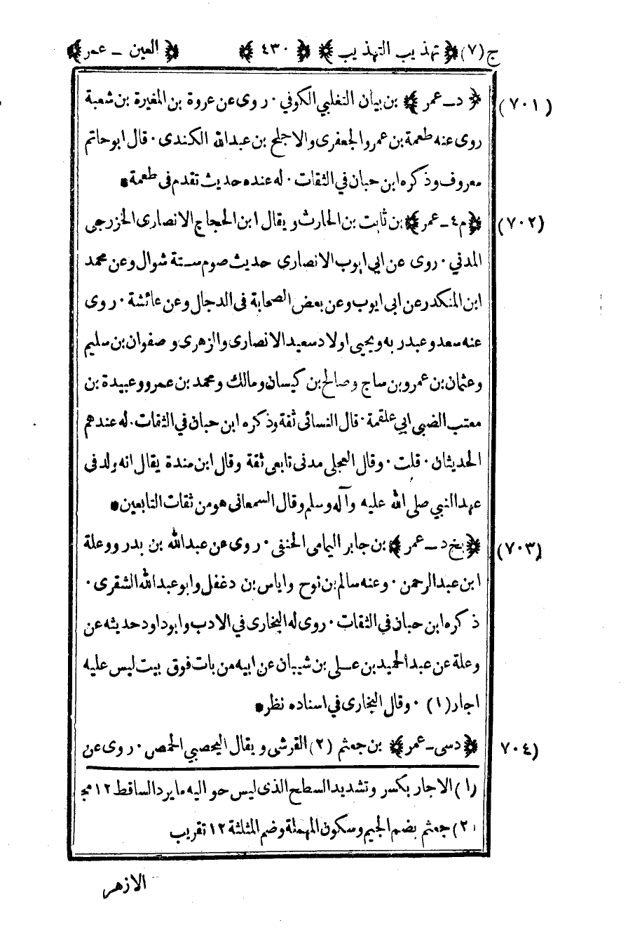 701- "د – عمر" بن بيان التغلبي الكوفي روى عن عروة بن المغيرة بن شعبة روى عنه طعمة بن عمرو الجعفري والأجلح بن عبد الله الكندي قال أبو حاتم معروف وذكره بن حبان في الثقات له عنده حديث تقدم في طعمة