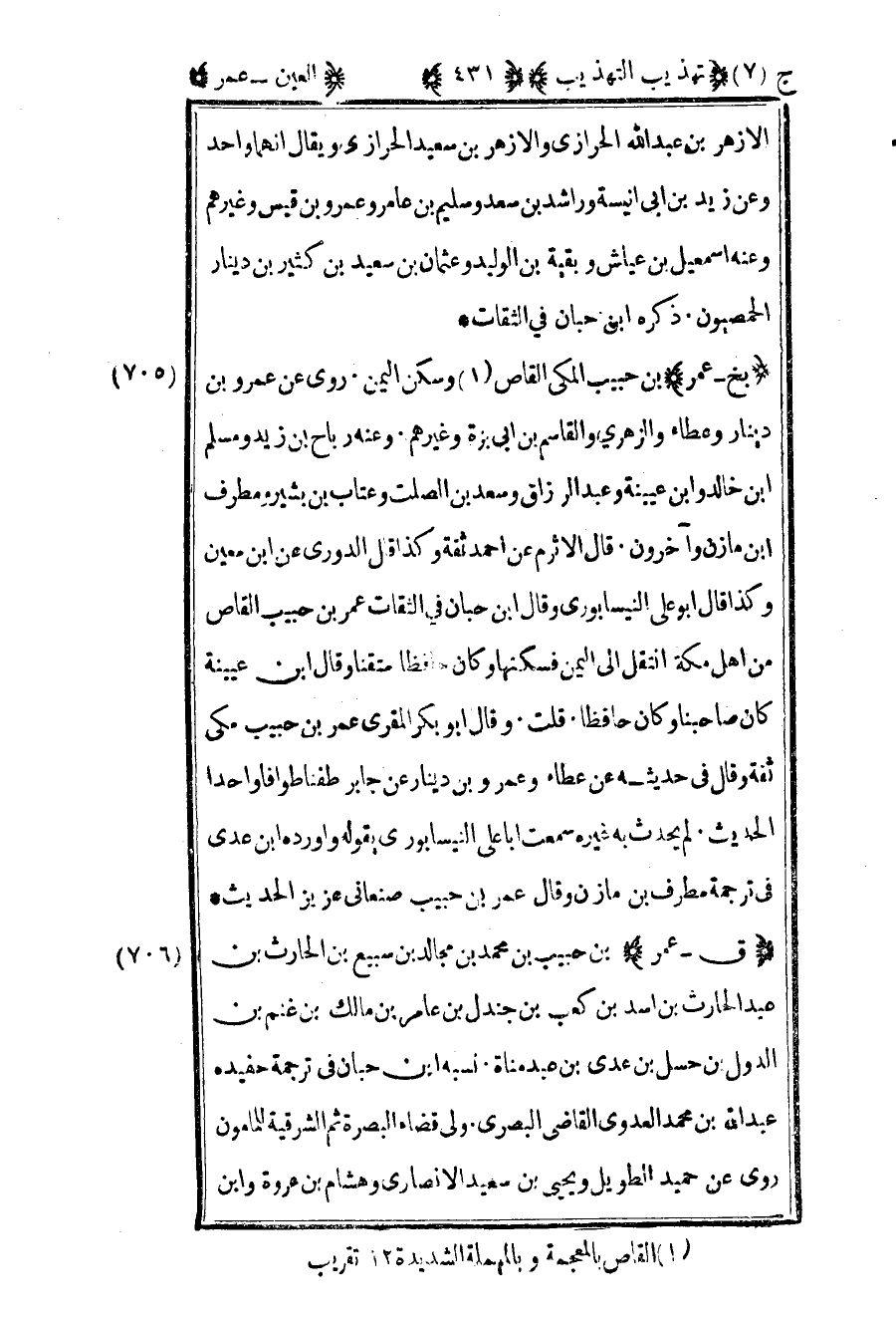 706- "ق – عمر" بن حبيب بن محمد بن مجالد بن سبيع بن الحارث بن عبد الحارث بن أسد بن كعب بن جندل بن عامر بن مالك بن غنم بن الدول بن حسل بن عدي بن عبد مناة نسبه بن حبان في ترجمة حفيده عبد الله بن محمد العدوي القاضي البصري ولي قضاء البصرة ثم الشرقية للمأمون روى عن حميد الطويل ويحيى بن سعيد الأنصاري وهشام بن عروة وابن
