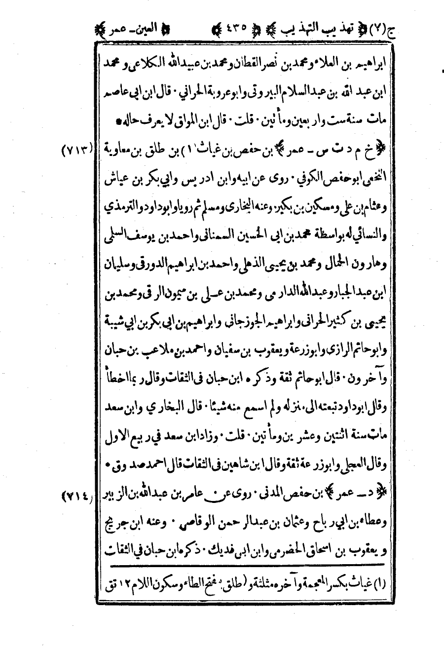 713- "خ م د ت س – عمر" بن حفص بن غياث1 بن طلق بن معاوية النخعي أبو حفص الكوفي روى عن أبيه وابن إدريس وأبي بكر بن عياش وعثام بن علي ومسكين بن بكير وعنه البخاري ومسلم ثم رويا وأبو داود والترمذي والنسائي له بواسطة محمد بن أبي الحسين السمناني وأحمد بن يوسف السلمي وهارون الحمال ومحمد بن يحيى الذهلي وأحمد بن إبراهيم الدورقي وسليمان بن عبد الجبار وعبد الله الدارمي ومحمد بن علي بن ميمون الرقي ومحمد بن يحيى بن كثير الحراني وإبراهيم الجوزجاني وإبراهيم بن أبي بكر بن أبي شيبة وأبو حاتم الرازي وأبو زرعة ويعقوب بن سفيان وأحمد بن ملاعب بن حبان وآخرون قال أبو حاتم ثقة وذكره بن حبان في الثقات وقال ربما أخطأ وقال أبو داود تبعته إلى منزله ولم أسمع منه شيئا قال البخاري وابن سعد مات سنة اثنتين وعشرين ومائتين قلت وزاد بن سعد في ربيع الأول وقال العجلي وأبو زرعة ثقة وقال بن شاهين في الثقات قال أحمد صدوق