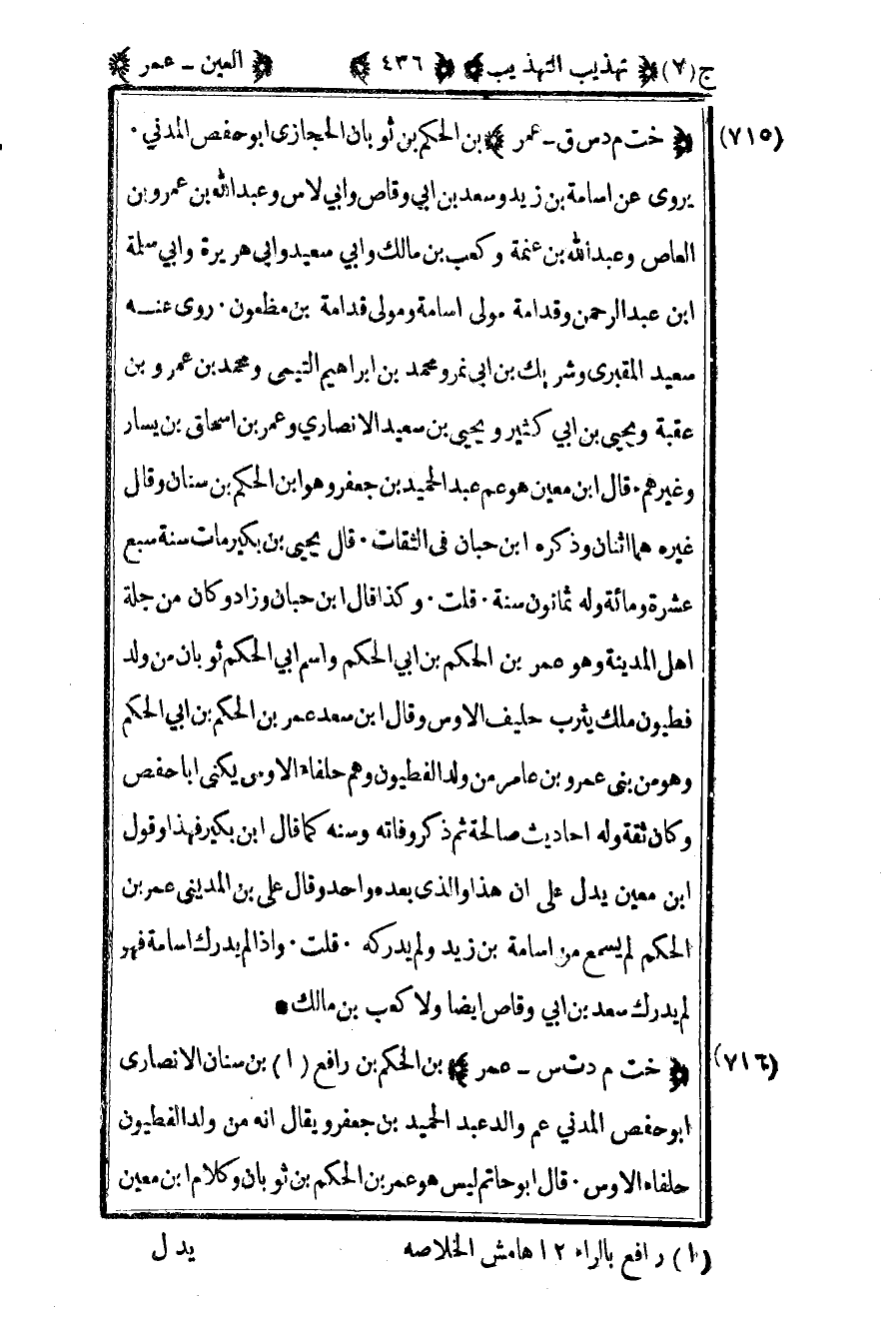 -716 "خت م د ت س – عمر" بن الحكم بن رافع1 بن سنان الأنصاري أبو حفص المدني عم والد عبد الحميد بن جعفر ويقال أنه من ولد الفطيون حلفاء الأوس قال أبو حاتم ليس هو عمر بن الحكم بن ثوبان وكلام بن معين