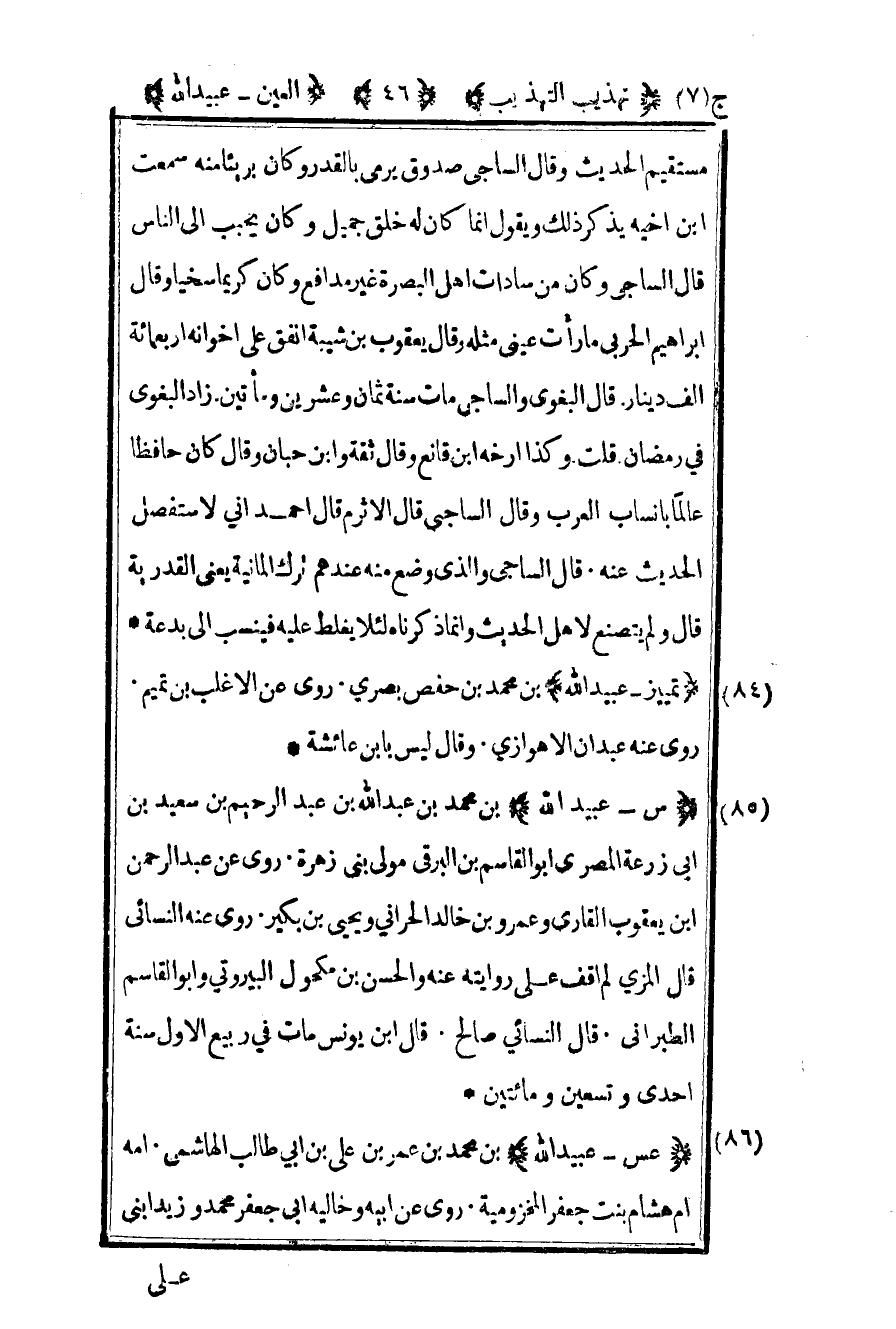 86- "عس - عبيد الله" بن محمد بن عمر بن علي بن أبي طالب الهاشمي أمه أم هشام بنت جعفر المخزومية روى عن أبيه وخاليه أبي جعفر محمد وزيد ابني