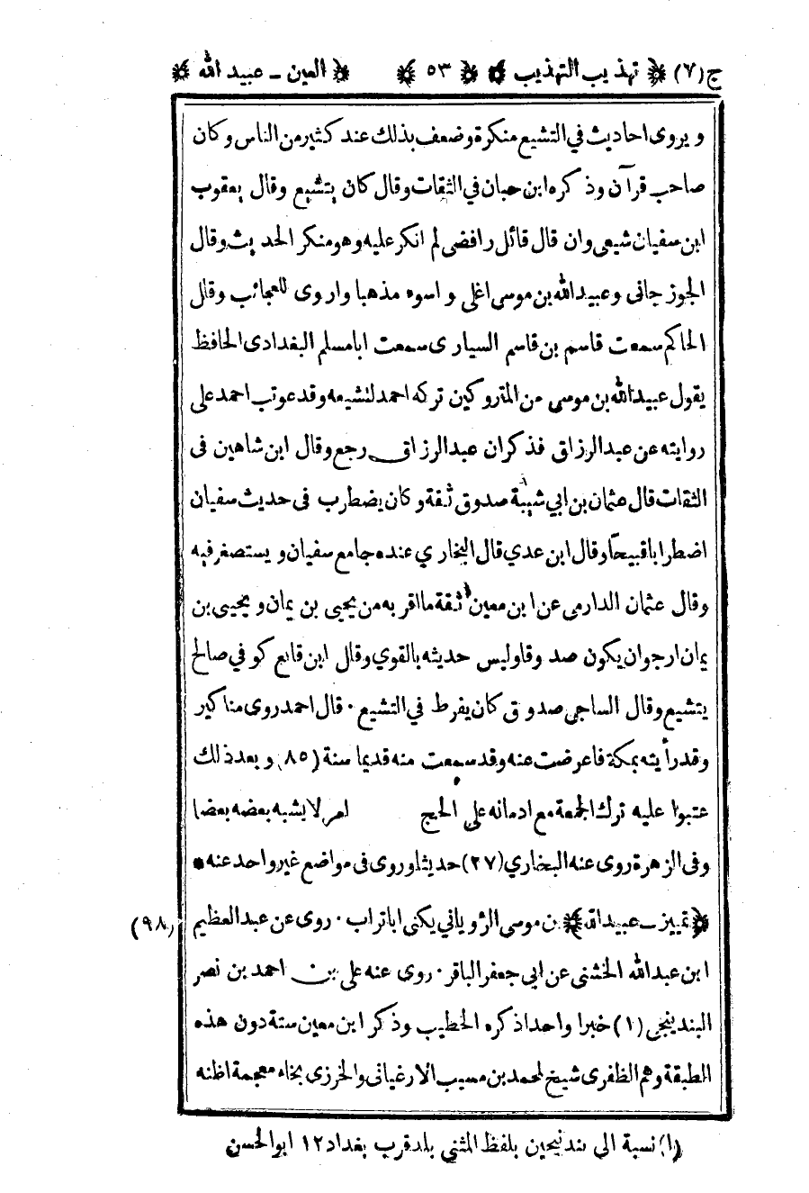 98- "تمييز - عبيد الله" بن موسى الرؤياني يكنى أبا تراب روى عن عبد العظيم بن عبد الله الخشني عن أبي جعفر الباقر روى عنه عن علي بن أحمد بن نصر البندينجي1 خبرا واحدا ذكره الخطيب وذكر بن معين ستة دون هذه الطبقة وهم الظفري شيخ لحد بن مسيب الأرغياني والخرزي بخاء معجمة أظنه