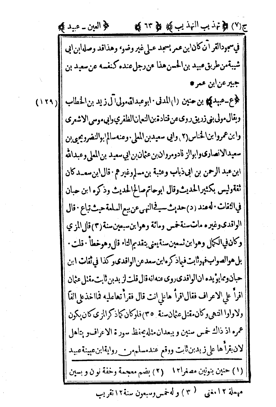 129- "ع – عبيد" بن حنين1 المدني أبو عبد الله مولى آل زيد بن الخطاب ويقال مولى بني زريق روى عن قتادة بن النعمان الظفري وأبي موسى الأشعري وابن عمر وابن الخناس2 وأبي سعيد بن المعلى وعنه سالم أبو النضر ويحيى بن سعيد الأنصاري وأبو الزناد ومروان بن عثمان بن أبي سعيد بن المعلى وعبد الله بن عبد الرحمن بن أبي ذباب وعتبة بن مسلم وغيرهم قال بن سعد كان ثقة وليس بكثير الحديث وقال أبو حاتم صالح الحديث ذكره بن حبان في الثقات له عند د حديث في النهي عن بيع السلعة حيث تباع قال الواقدي وغيره مات سنة خمس ومائة وهو بن سبعين سنة3 قال المزي وكان في الكمال وهو بن تسعين سنة يعني بتقديم التاء قال وهو خطأ قلت بل هو الصواب فهو ثابت فيما ذكره بن سعد عن الواقدي وكذا في ثقات بن حبان ومما يؤيده أن الواقدي روى عنه أنه قال قلت لزيد بن ثابت مقتل عثمان اقرأ علي الأعراف فقال اقرأها علي أنت قال فقرأتها عليه فما أخذ علي ألفا ولا واوا انتهى وكان مقتل عثمان سنة 35 فلو كان كما ذكر المزي كأن يكون عمره إذ ذاك خمس سنين ويبعدان مثله يحفظ سورة الأعراف ويتأهل لأن يقرأها على زيد بن ثابت ووقع عند مسلم من رواية بن عيينة عبيد