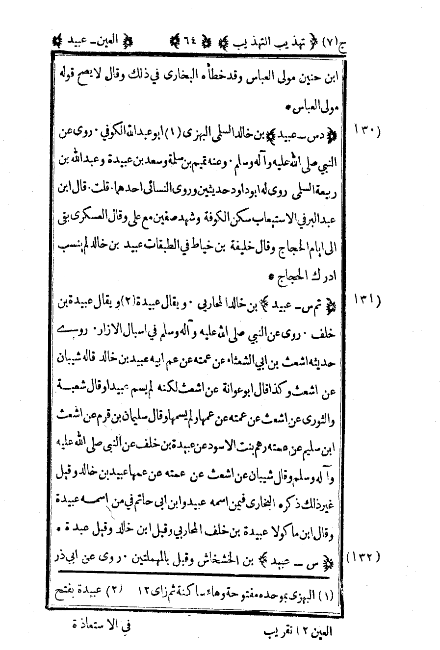 130- "د س – عبيد" بن خالد السلمي البهزي1 أبو عبد الله الكوفي روى عن النبي صلى الله عليه وسلم وعنه تميم بن سلمة وسعد بن عبيدة وعبد الله بن ربيعة السلمي روى له أبو داود حديثين وروى النسائي أحدهما قلت قال بن عبد البر في الاستيعاب سكن الكوفة وشهد صفين مع علي وقال العسكري بقي إلى أيام الحجاج وقال خليفة بن خياط في الطبقات عبيد بن خالد لم ينسب أدرك الحجاج