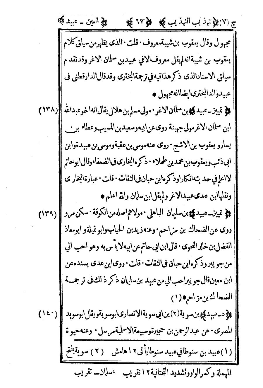 139- "تمييز عبيد" بن سليمان الباهلي مولاهم أصله من الكوفة سكن مرو روى عن الضحاك بن مزاحم وعنه زيد بن الحباب وأبو تميلة وأبو معاذ الفضل بن خالد النحوي قال بن أبي حاتم عن أبيه لا بأس به وهو أحب إلي من جويبر وذكره بن حبان في الثقات قلت روى بن عدي بسنده عن بن معين قال جويبر أحب إلي من عبيد بن سليمان ذكر ذلك في ترجمة الضحاك بن مزاحم2