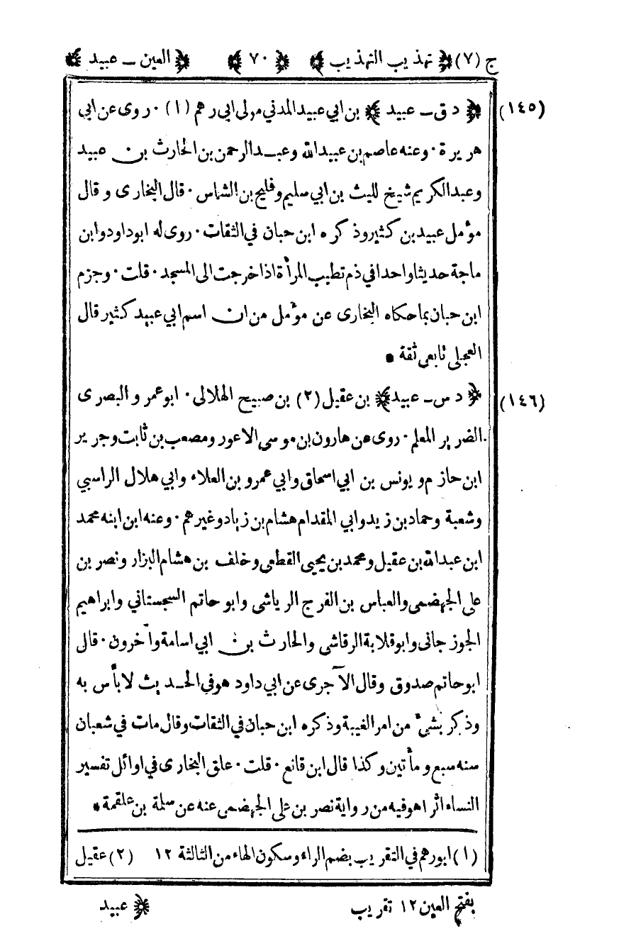 146- "د س – عبيد" بن عقيل2 بن صبيح الهلالي أبو عمرو البصري الضرير المعلم روى عن هارون بن موسى الأعور ومصعب بن ثابت وجرير بن حازم ويونس بن أبي إسحاق وأبي عمرو بن العلاء وأبي هلال الراسبي وشعبة وحماد بن زيد وأبي المقدام هشام بن زياد وغيرهم وعنه بن ابنه محمد بن عبد الله بن عقيل ومحمد بن يحيى القطعي وخلف بن هشام البزار ونصر بن علي الجهضمي والعباس بن الفرج الرياشي وأبو حاتم السجستاني وإبراهيم الجوزجاني أبو قلابة الرقاشي والحارث بن أبي أسامة وآخرون قال أبو حاتم صدوق وقال الآجري عن أبي داود هو في الحديث لا بأس به وذكر بشيء من أمر الغيبة وذكره بن حبان في الثقات وقال مات في شعبان سنة سبع ومائتين وكذا قال بن قانع قلت علق البخاري في أوائل تفسير النساء أثرا هو فيه من رواية نصر بن علي الجهضمي عنه عن سلمة بن علقمة