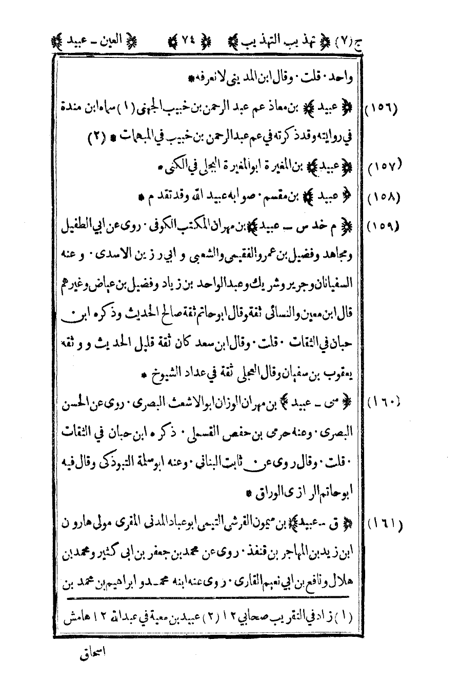 159- "م خد س – عبيد" بن مهران المكتب الكوفي روى عن بن الطفيل ومجاهد وفضيل بن عمرو الفقيمي والشعبي وأبي رزين الأسدي وعنه السفيانان وجرير وشريك وعبد الواحد بن زياد وفضيل بن عياض وغيرهم قال بن معين والنسائي ثقة وقال أبو حاتم ثقة صالح الحديث وذكره بن حبان في الثقات قلت وقال بن سعد كان ثقة قليل الحديث ووثقه يعقوب بن سفيان وقال العجلي ثقة في عداد الشيوخ