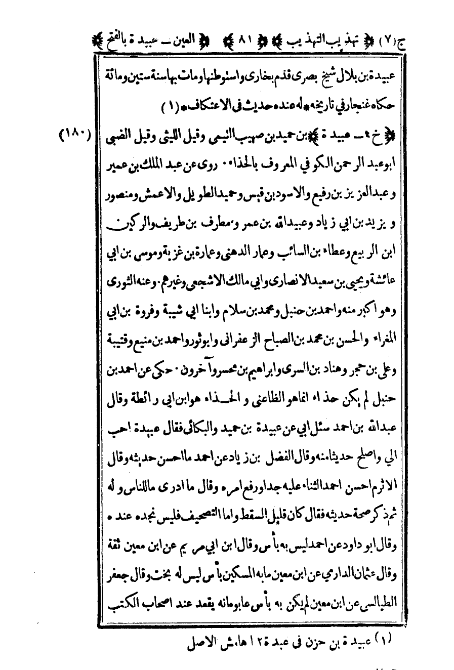 180- "خ4 – عبيدة" بن حميد بن صهيب التيمي وقيل الليثي وقيل الضبي أبو عبد الرحمن الكوفي المعروف بالحذاء روى عن عبد الملك بن عمير وعبد العزيز بن رفيع والأسود بن قيس وحميد الطويل والأعمش ومنصور ويزيد بن أبي زياد وعبيد الله بن عمر ومطرف بن طريف والركين بن الربيع وعطاء بن السائب وعمار الدهني وعمارة بن غزية وموسى بن أبي عائشة ويحيى بن سعيد الأنصاري وأبي مالك الأشجعي وغيرهم وعنه الثوري وهو أكبر منه وأحمد بن حنبل ومحمد بن سلام وابنا أبي شيبة وفروة بن أبي المغراء والحسن بن محمد بن الصباح الزعفراني وأبو ثور وأحمد بن منيع وقتيبة وعلي بن حجر وهناد بن السري وإبراهيم بن محسر وآخرون حكى عن أحمد بن حنبل لم يكن حذاء إنما هو الظاعني والحذاء هو بن أبي رائطة وقال عبد الله بن أحمد سئل أبي عن عبيدة بن حميد والبكائي فقال عبيدة أحب ألي وأصلح حديثا منه وقال الفضل بن زياد عن أحمد ما أحسن حديثه وقال الأثرم أحسن أحمد الثناء عليه جدا ورفع أمره وقال ما أدرى ما للناس وله ثم ذكر صحة حديثه فقال كان قليل السقط وأما التصحيف فليس نجده عنده وقال أبو داود عن أحمد ليس به بأس وقال بن أبي مريم عن أبن معين ثقة وقال عثمان الدارمي عن بن معين ما به المسكين بأس ليس له بخت وقال جعفر الطيالسي عن بن معين لم يكن به بأس عابوه أنه يقعد عند أصحاب الكتب