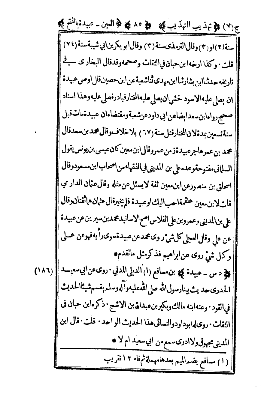 186- "د س – عبيدة" بن مسافع1 الديلي المدني روى عن أبي سعيد الخدري حديث بينا رسول الله صلى الله عليه وسلم يقسم شيئا الحديث في القود وعنه ابنه مالك وبكير بن عبد الله بن الأشج ذكره بن حبان في الثقات روى له أبو داود والنسائي هذا الحديث الواحد قلت قال بن المديني مجهول ولا أدري سمع من أبي سعيد أم لا