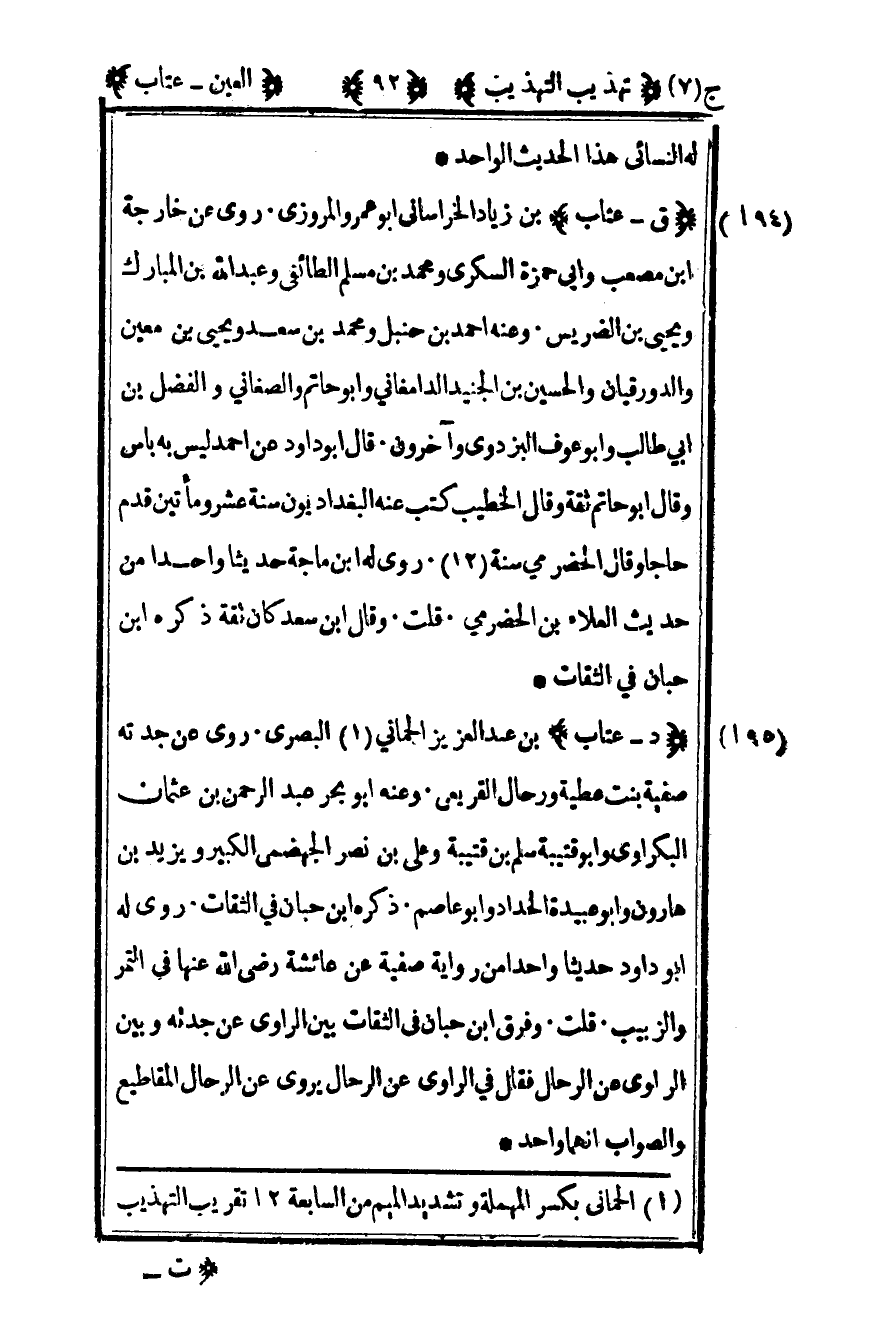 195- "د – عتاب" بن عبد العزيز الحمان1ي البصري روى عن جدته صفية بنت عطية ورحال القريعي وعنه أبو بحر عبد الرحمن بن عثمان البكراوي وأبو قتيبة سلم بن قتيبة وعلي بن نصر الجهضمي الكبير ويزيد بن هارون وأبو عبيدة الحداد وأبو عاصم ذكره بن حبان في الثقات روى له أبو داود حديثا واحدا من رواية صفية عن عائشة رضي الله عنها في التمر والزبيب قلت وفرق بن حبان في الثقات بين الراوي عن جدته وبين الراوي عن الرحال فقال في الراوي عن الرحال يروي عن الرحال المقاطيع والصواب أنهما واحد