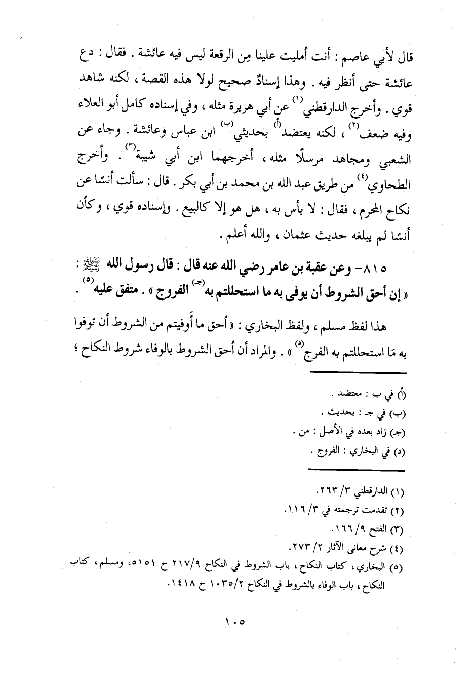 (¬5) البخاري، كتاب النكاح، باب الشروط في النكاح 9/ 217 ح 5151، ومسلم، كتاب النكاح، باب الوفاء بالشروط في النكاح 2/ 1035 ح 1418.