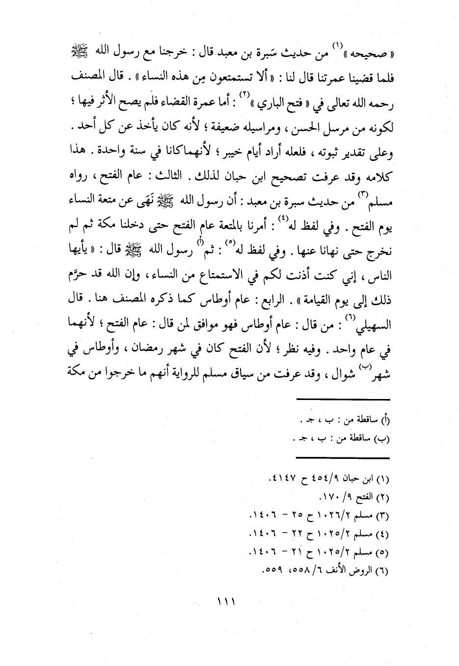 "صحيحه" (¬1) من حديث سَبرة بن معبد قال: خرجنا مع رسول الله - صلى الله عليه وسلم - فلما قضينا عمرتنا قال لنا: "ألا تستمتعون مِن هذه النساء". قال المصنف رحمه الله تعالى في "فتح الباري" (¬2): أما عمرة القضاء فلم يصح الأثر فيها؛ لكونه من مرسل الحسن، ومراسيله ضعيفة؛ لأنه كان يأخذ عن كل أحد. وعلى تقدير ثبوته، فلعله أراد أيام خيبر؛ لأنهما كانا في سنة واحدة. هذا كلامه وقد عرفت تصحيح ابن حبان لذلك. الثالث: عام الفتح، رواه مسلم (¬3) من حديث سبرة بن معبد: أن رسول الله - صلى الله عليه وسلم - نَهَى عن متعة النساء يوم الفتح. وفي لفظ له (¬4): أمرنا بالمتعة عام الفتح حتى دخلنا مكة ثم لم نخرج حتى نهانا عنها. وفي لفظ له (¬5): ثم (أ) رسول الله - صلى الله عليه وسلم - قال: "يأيها الناس، إني كنت أذنت لكم في الاستمتاع من النساء، وإن الله قد حرَّم ذلك إلى يوم القيامة". الرابع: عام أوطاس كما ذكره المصنف هنا. قال السهيلي (¬6): من قال: عام أوطاس فهو موافق لمن قال: عام الفتح؛ لأنهما في عام واحد. وفيه نظر؛ لأن الفتح كان في شهر رمضان، وأوطاس في شهر (ب) شوال، وقد عرفت من سياق مسلم للرواية أنهم ما خرجوا من مكة